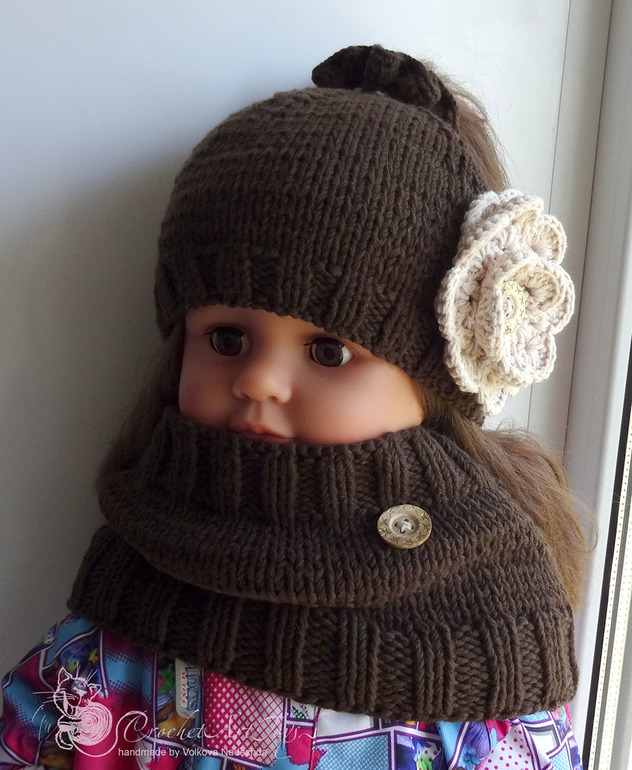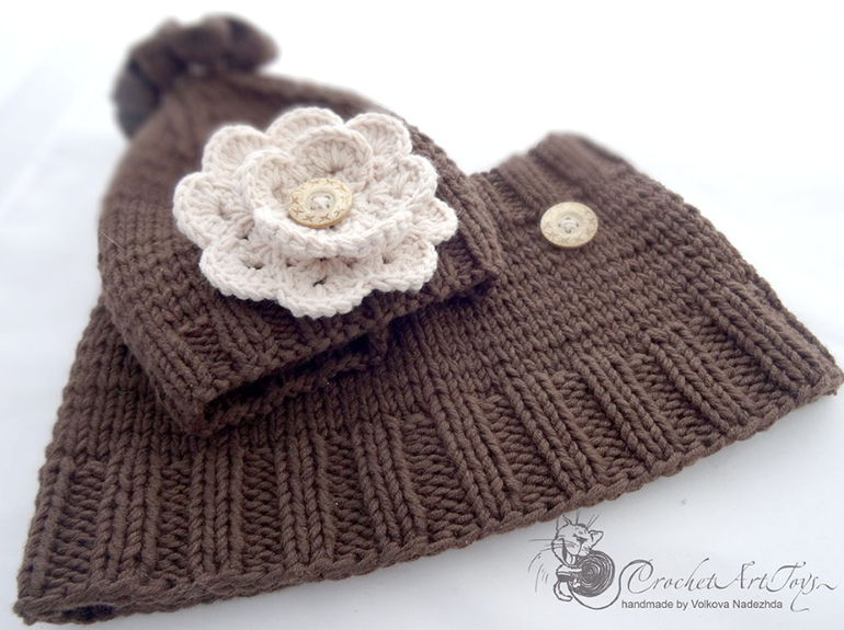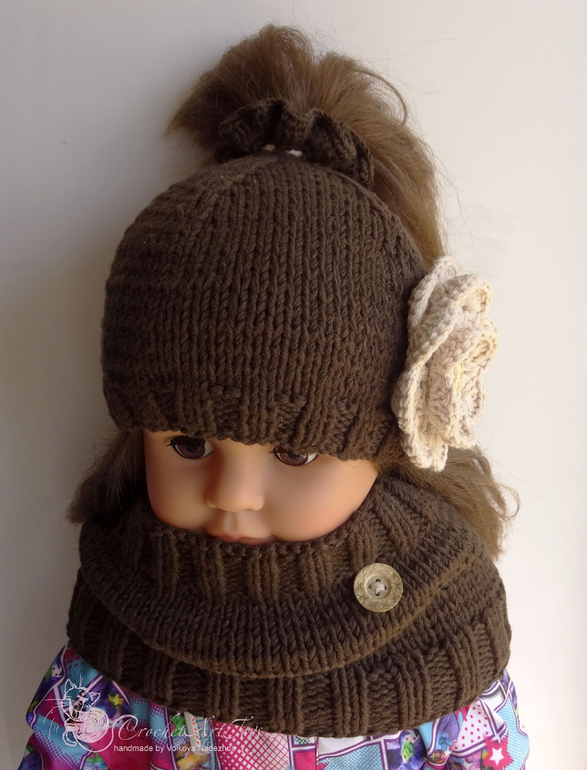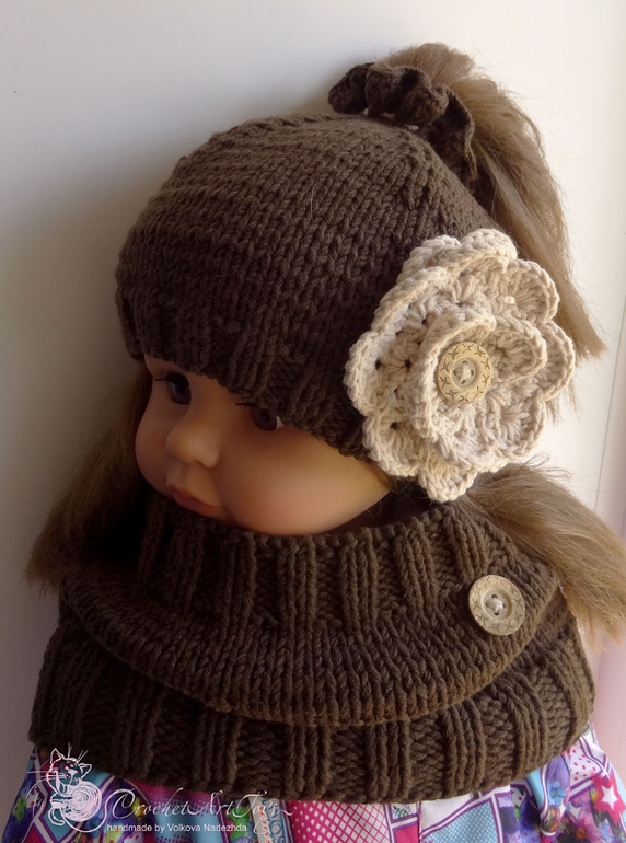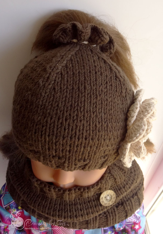Вязание спицамиСвязала комплект для малышки красивого шоколадного цвета. Шапка с отверстием для хвостика. Пряжа полухлопок, спицы 3, 3.5 и 4.