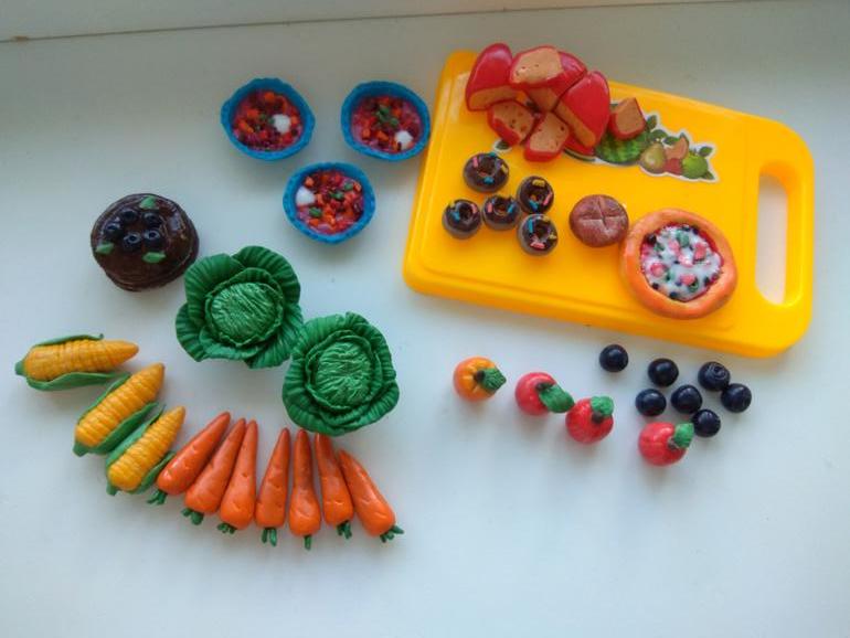 Да что угодно. Это можно сказать такая кукольная еда. Овощи можно сдать в песок или с крупами, тортики пицца играть в пиццерию и т.д