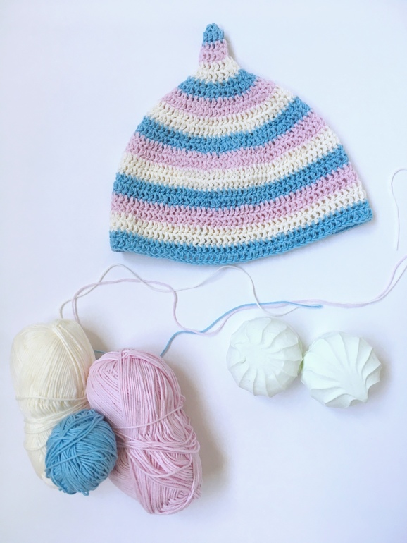 Всем привет!Пробую новые ниточки.Вот такая легкая,воздушная шапулька-зефирка из нежнейшего мягкого хлопка получилась!Очень нежные и приятные глазу цвета.
