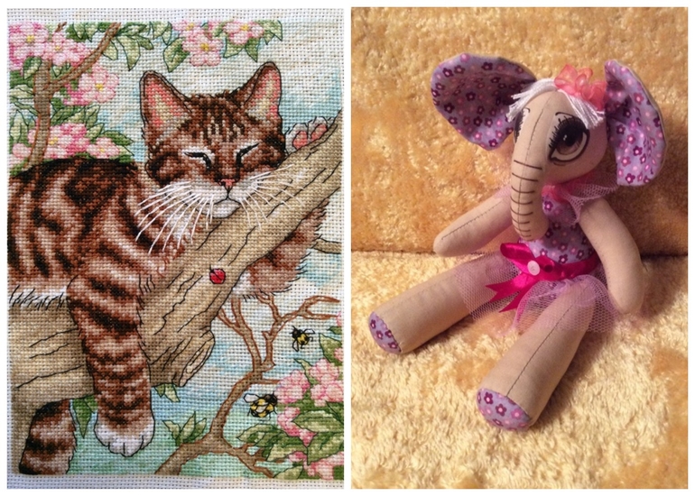 Ну и я вышила котенка и сшила слонишку