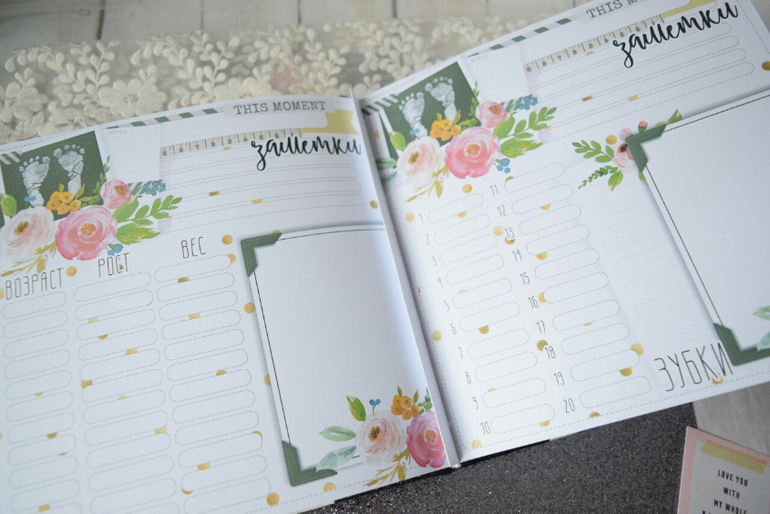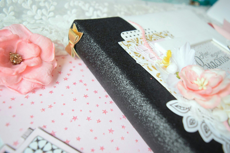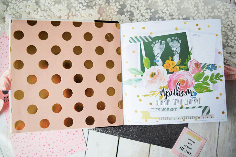 Быстренько покажу милейший девочковый альбом, выполненный с учетом всех современных веяний: тут и матовый гладкий кожзам, и черный глиттерный, который как нелзя лучше подчеркивает контраст страниц внутри. Шейкер, и множество интересных деталей. Ну а страницы- вы только посмотрите! Мамочке точно будет, что записать и перечитывать, когда дочка станет взрослой)