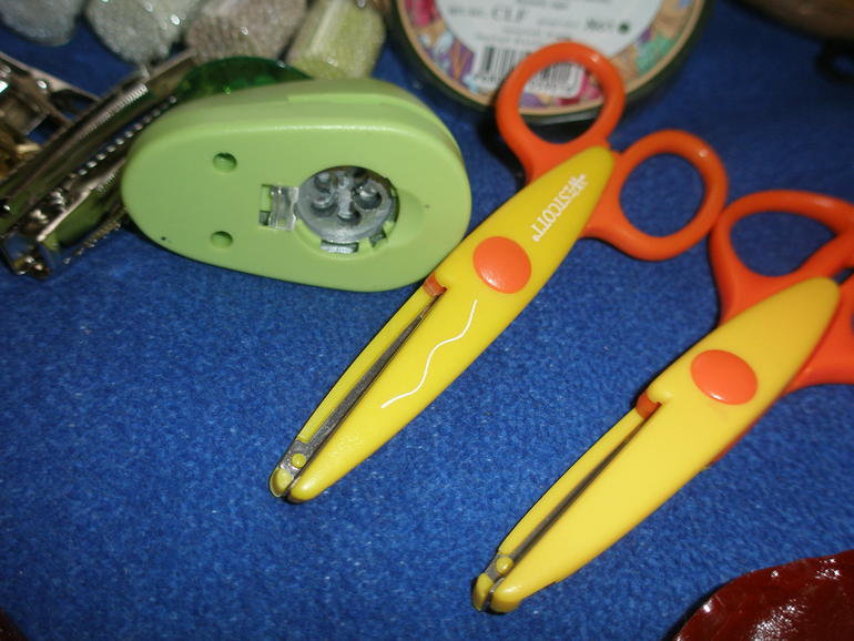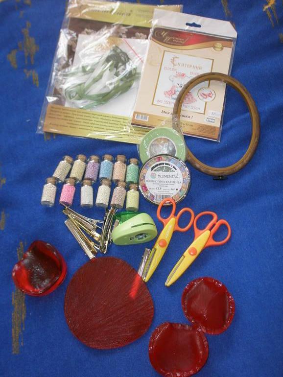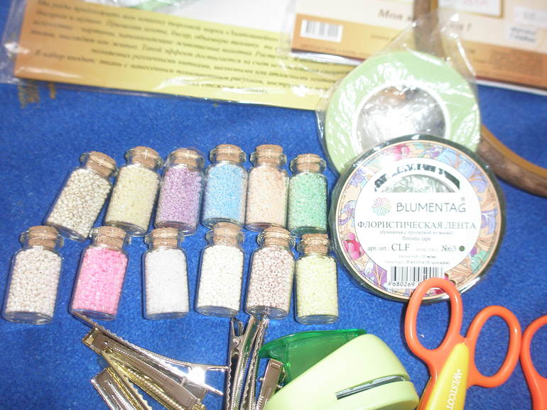Бисер - весь самый обычный - гамма. Основы для заколок, пяльца с резинкой, есть еще пяльца рамка - не сфотографировала ( на формат а4 или даже чуть больше), Ножницы - зиг-заг и острая волна, дырокол цветочек ( у него отломана прозрачная крыжка сзади, но дырокол рабочий), тейп лента - светло зеленая и темно-зеленая, молды пластиковые.