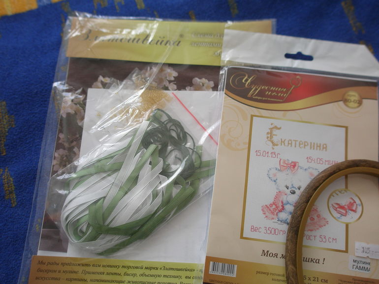 Два набора для вышивки - один лентами на рисунке, второй метрика для девочки - счетный крест.