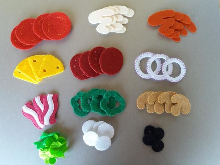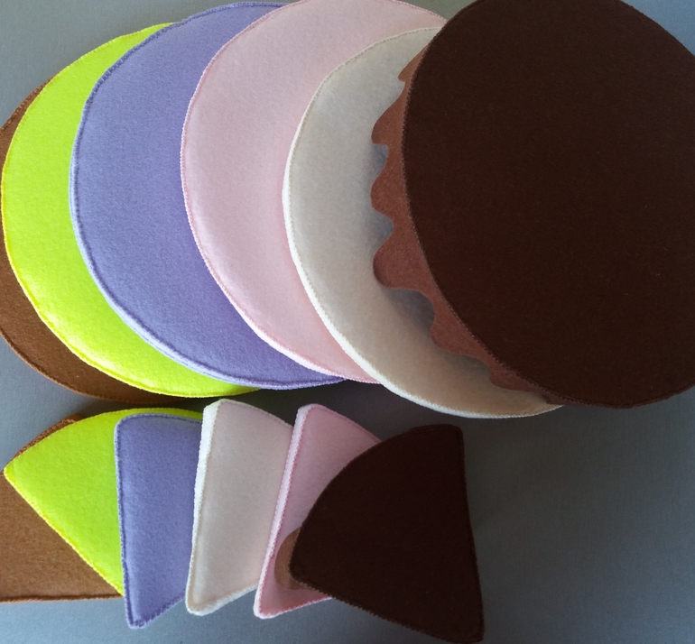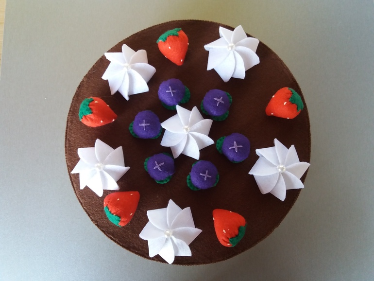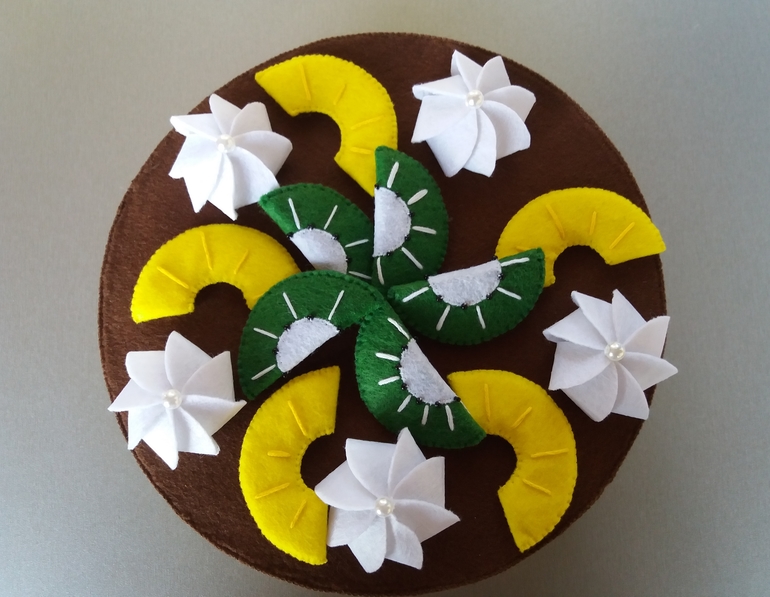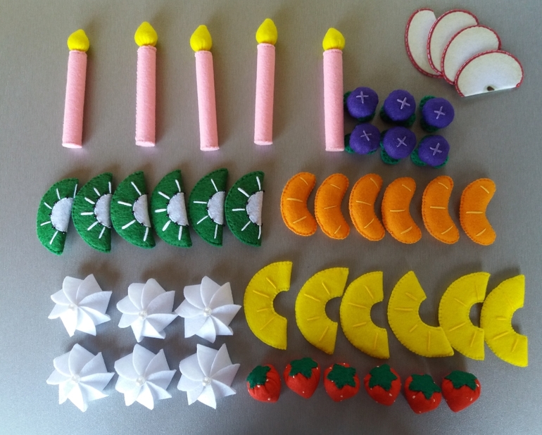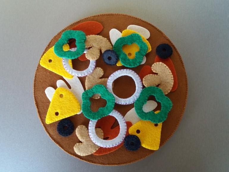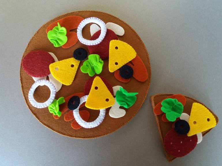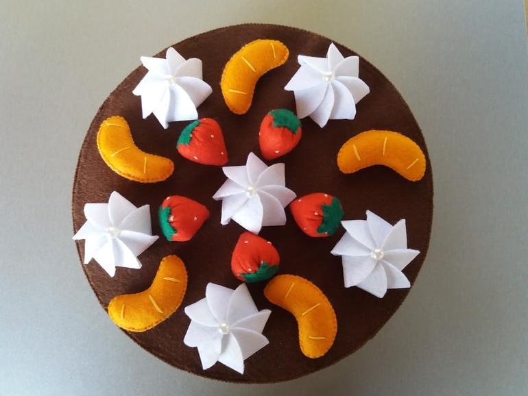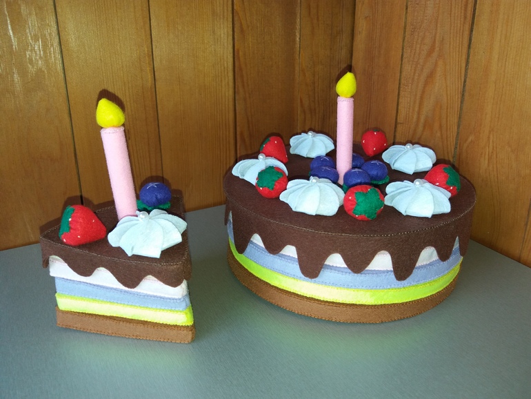 ФетрДобрый день! Сшила развивающий торт - пицца из корейского фетра диаметром 18,5 см. В состав входит: 5 коржей и 5 кусочков, шоколадная глазурь, 5 свечей, которые крепятся на магнитах, различные фрукты и овощи.
