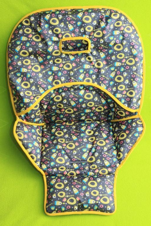 2. Чехол на стульчик для кормления Chicco Polly. Принтованная плащёвая ткань с водонепроницаемым полимерным покрытием внутри, наполнитель - холлофайбер плотностью 500 гр., все прорези под ремни и отстрочки выполнены, жёсткая пластиковая вставка в нижней части чехла присутствует.