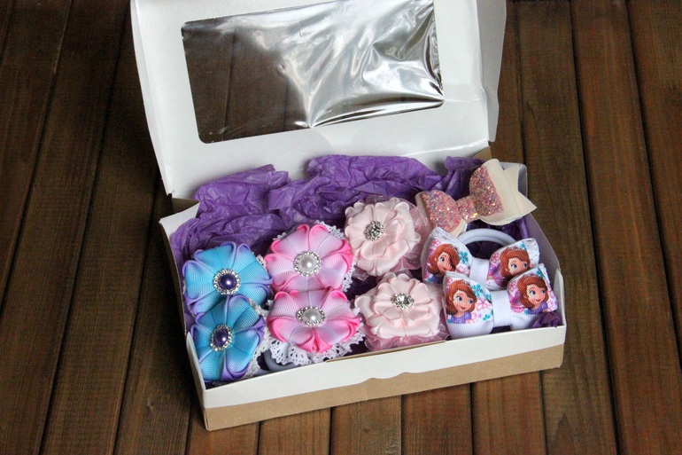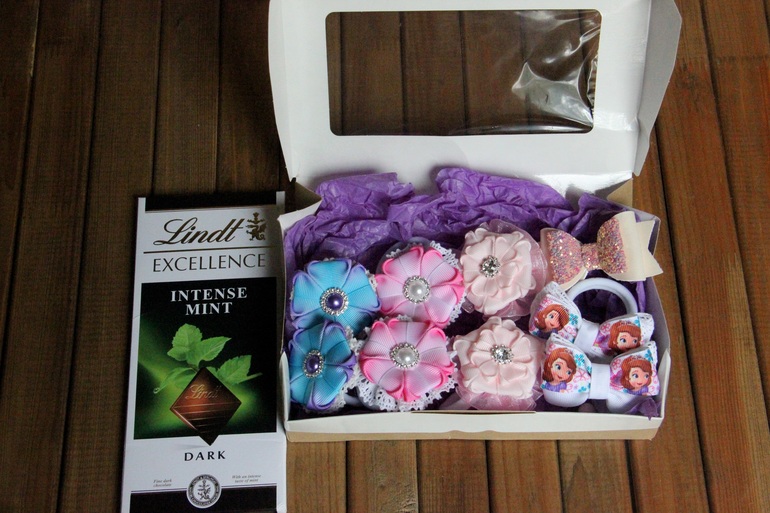 4 набора резиночек (такие прямо мимими, мы с дочкой в восторге!) и заколка (та, что сверкает пуще всех)))