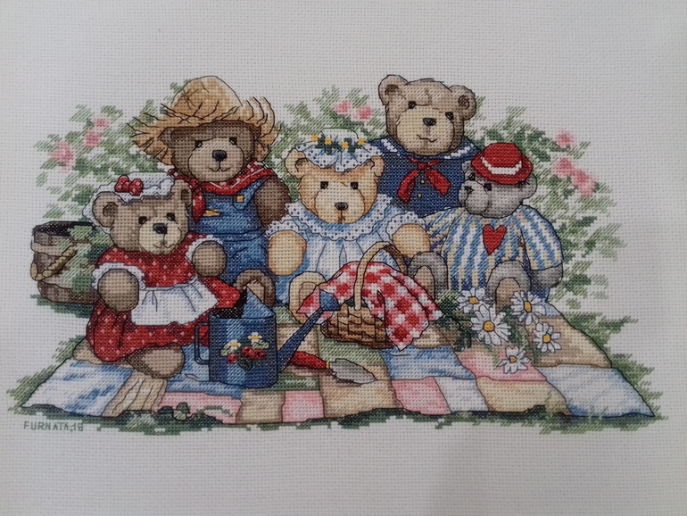 А я завершила своих медведиков! Постирала и отпарила. Вот такие они получились. Начинаю вторую вышивку из мишек. Размер пртмерно одинаковый и сюжеты схожие. Будут потом одинаково оформлены в рамочки для стены в дочкиной комнате. Но вторую работу в рамках калейдоскопа уже, конечно, не успею.