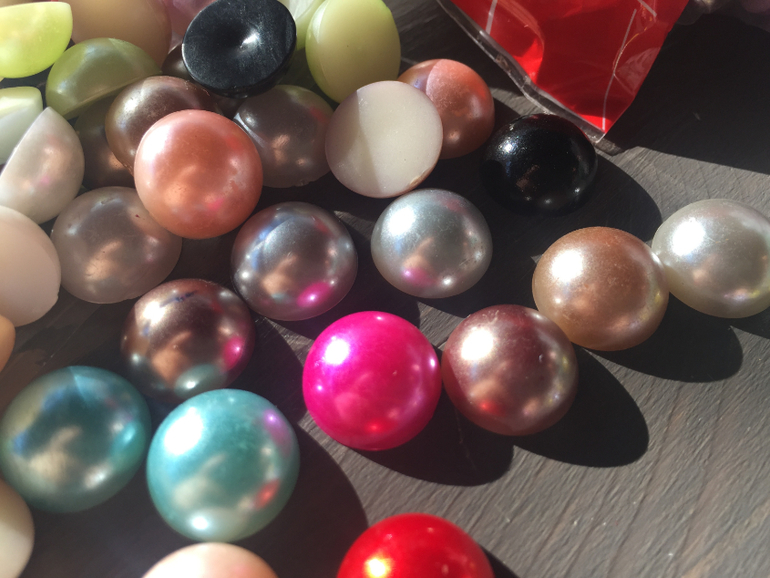 Недавно заказала себе кучу разных пластиковых полубусин 12-14 мм и ждала их с надеждой. Но они пришли все в царапинах и потертостях. На фото постаралась заснять этот брак, но не совсем получилось. Но там много царапин разной степени и они все в потертостях. Из всей этой кучи можно найти нормальных штучек 20-30, а все остальное это брак. Такие я использовать не буду для своих серединок