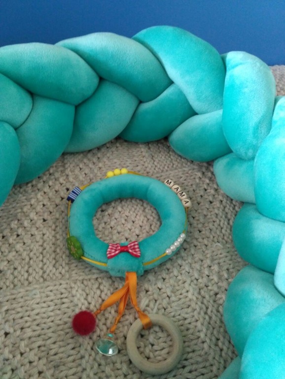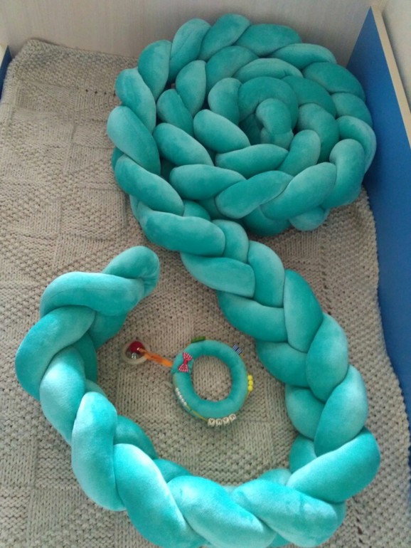 Длина - 3,6м (по периметру кроватки) - легко укладывать, менять, убирать, не надо ничего привязывать/завязывать.