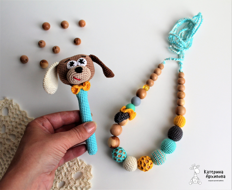 Связанная из хлопковой пряжи, собачка погремушка и ароматные можжевеловые бусы в цвет. Так же к слону обязательно будет прилагаться какая-либо вкусняшка... это докуплю уже тогда как почитаю дневник выигравшего!!!! ;-)