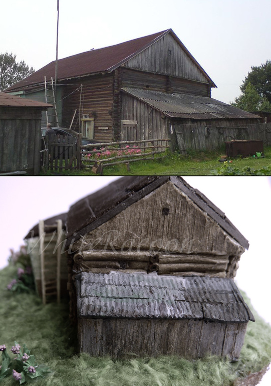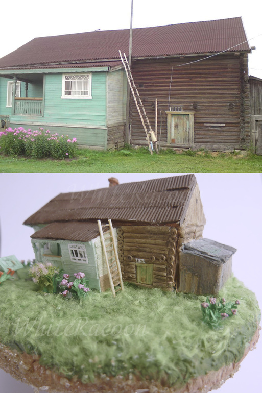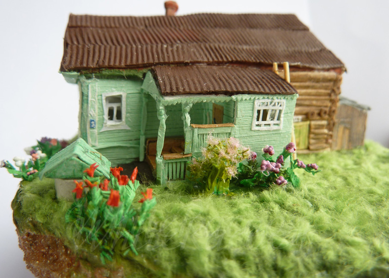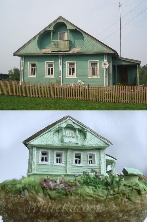 Масштаб работы примерно 1:300 - не ровно, конечно, но и цели точного масштабирования не стояло - надо было лишь вписать дом в пластиковый шар 10 см. После моих привычных 30 мм (3 см) - это просто гигант!.. Делала по фотографиям. Домик очень хитрый, причудливый, тут одного цвета - там другого, тут доски - там брёвна, тут наличники с ромбиками - там дверца для кур... Колоритный и неординарный. Два с половиной месяца работы.