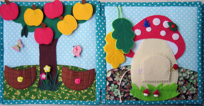 Первый разворот.1.Собираем яблочки в корзинки.Красные в корзинку с красным яблочком.жёлтые в корзинку с жёлтым яблочком.Бабочка и птичка на перетяжке (можно дёргать) 2.Грибочек в котором прячется мышка.