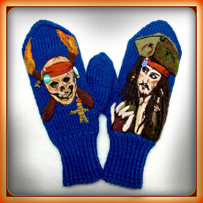 Вязание спицамиУх... и задали мне задачку))) Изобразить на рукавичках пирата) Да еще и известного))) Джека Воробья))