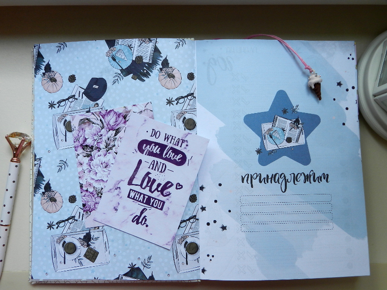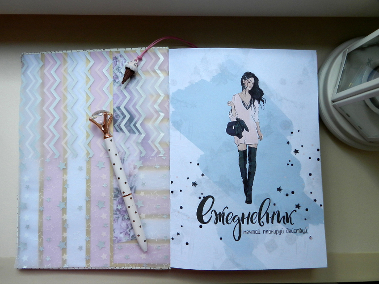 СкрапбукингДоброго вечера! Такой он вкусный-новый мой ежедневничек)) Обложка из кожзама-цвета молочного золота. Подвеска-мороженко, закладочки-открытки и стильные странички. Далее много фото.
