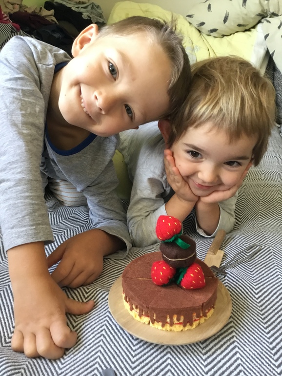 Никакие украшения на торт приклеивать я не стала, пусть играют в кондитеров и украшают сами и эту игру они уже протестировали с ранее сшитыми по книге макаронами и клубничкой и даже коричневый Лего, как плитка шоколада :)))