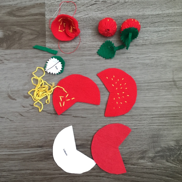Здесь на одном фото все этапы шитья клубники. Вышивала мулине вперёд иголкой вразброс, потом сшить боковые стенки швом назад иглу . По краю конуса прошить вперёд иголкой и стянуть набитый конус плотно, закрепить, приклеить вырезанный листочек горячим пистолетом.