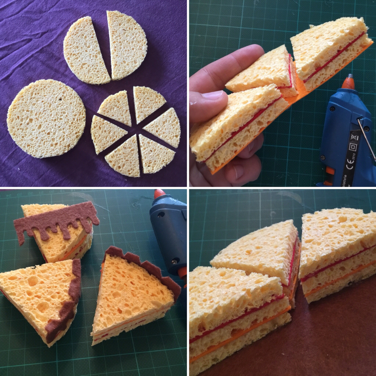 Тортик в книге кстати неописан, но на фотографиях присутствует, не сложно было продумать процесс, ниже по моим фото процесс понятен, диаметр вы можете сами себе придумать. Я ориентировалась по размерам целлюлозных мочалок, специально купленных, просто шикарная замена бисквиту. Клеила горячим пистолетом.