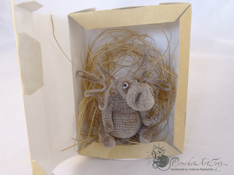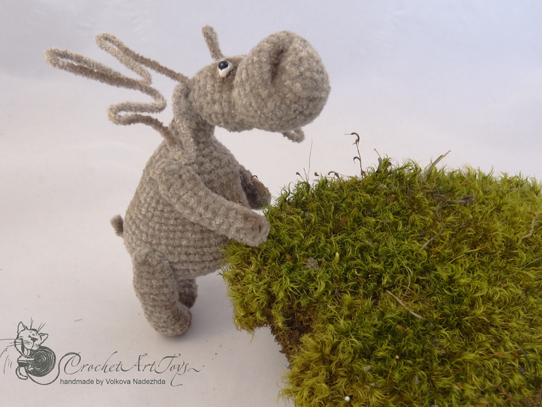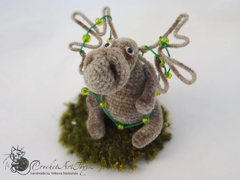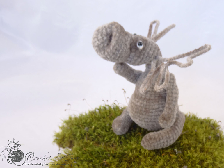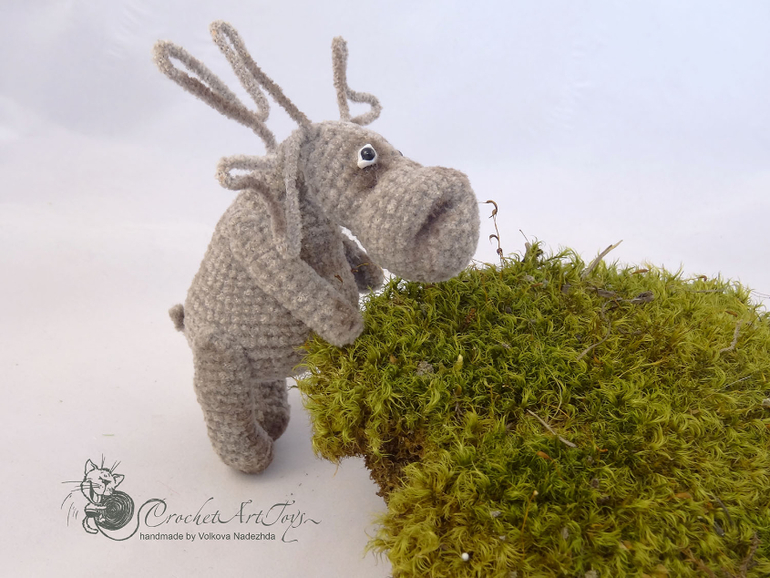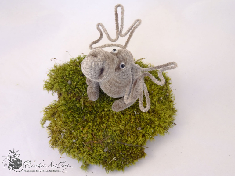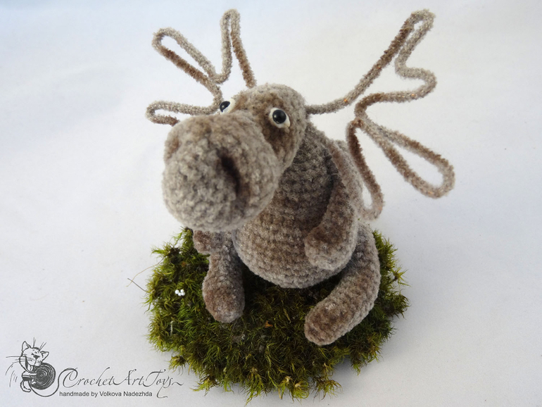 Амигуруми (вязаные игрушки)По мк Натальи Трофимовой связался малыш лосик. Пряжа велюр бобинный, крючок 1. Лапки на шплинтах подвижны, рога и голова на проволочном каркасе - гнется. Глаза из полимерной глины. тонирован сухой пастелью. Ростиком сидя 8 см (без учета рожек)