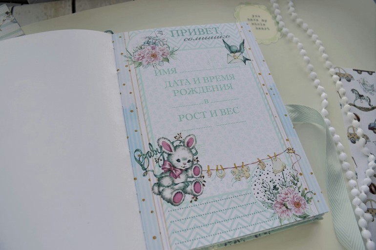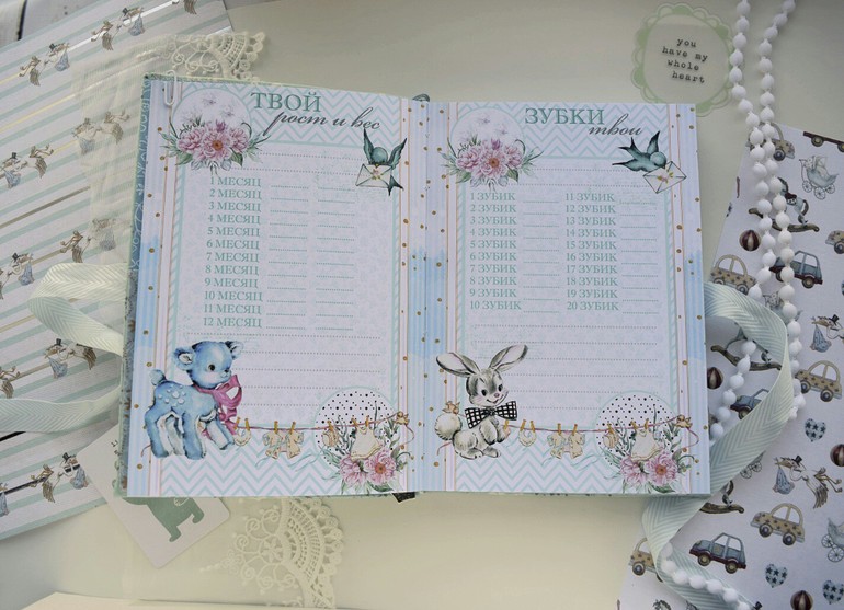 Вот и сотворился дневничок для нежной, любящей, чуткой мамы: тут и кружево, и цветы, и ленты.. его так и хочется прижать и не отпускать. А странички с милыми персонажами изобилуют разделами: от рождения и до школы. Тут есть все: и крещение, и отпечатки ручки и ножки, и прививки..В общем, это настоящий архив, который к тому же еще и красивый) Да, от скромности сегодня я не умру)