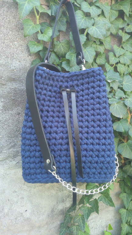 Торба в цвете синий бархат, с элементами из натуральной кожи ( дно, утяжка, короткая ручка и комбинированная ручка)