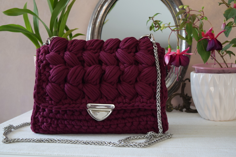 Кроссбоди цвета марсала на металлической цепочке и с портфельным замком цвета никель.