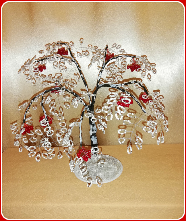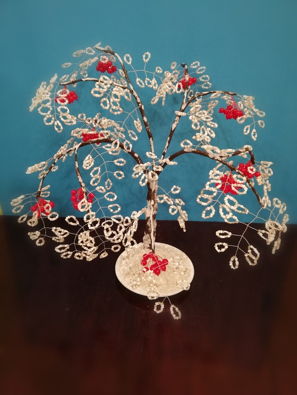 Бисер. Бисероплетение. Украшения из бисера.Хоть на календаре осень, потянула меня в зиму))) С бисером работала практически впервые не считая небольших расшитых участков брошей. Высота зимней рябины с подставкой 40 см.