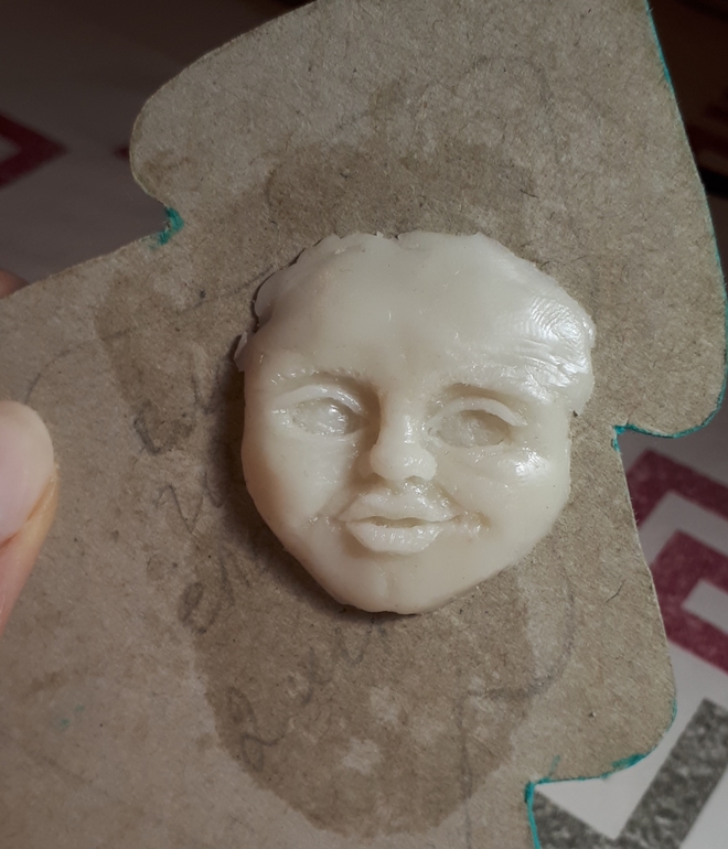 У вас силиконовая прям мордашка получилась. Мне нравится. Не знаю, что за глина. Я брала "Артифакт" Питерскую. Белую для мордашки. Запекать при 100 градусах. Может она у вас прозрачная?