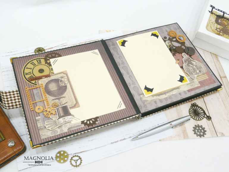 Очень удобный формат - 20*20 см. Мягкая обложка обтянута хлопком и украшена шестеренками и металлическим декором, вы только посмотрите на ключик к сердцу вашего мужчины!