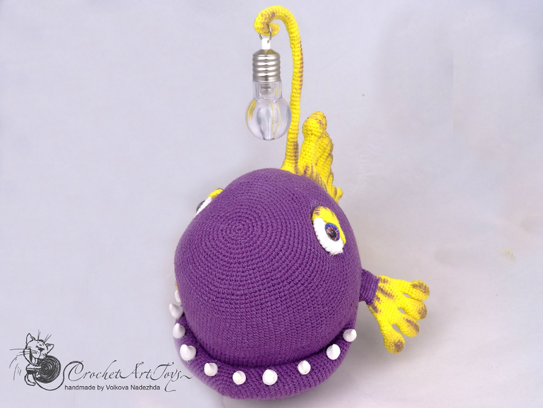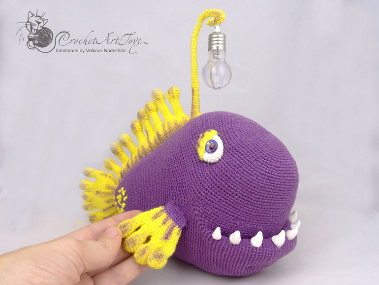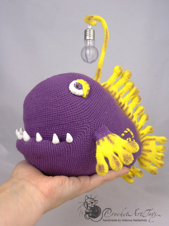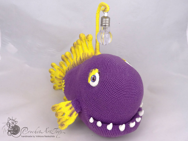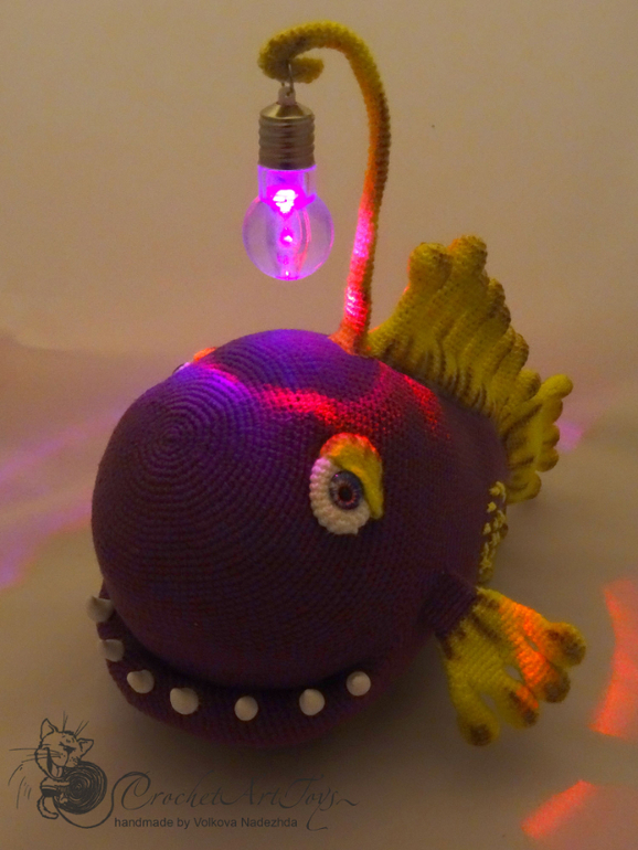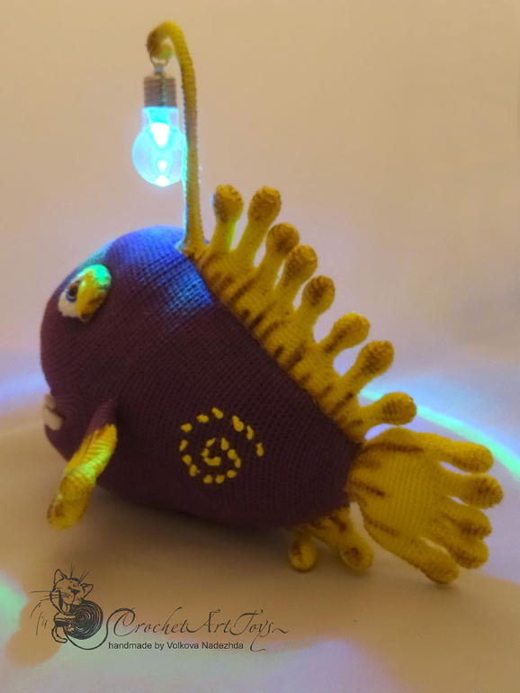 Амигуруми (вязаные игрушки)Чудо рыба -морской удильщик- связана по мк Александры simba из полухлопковой пряжи Котон голд и Новелти, крючок 1.25. Длина рыбы -около 25 см. "Удочка" на проволочном каркасе - подвижна, на конце мигающая лампочка, благодаря которой чудо рыба подсвечивается разными цветами. Зубы слеплены из полимерной глина, плавники тонированы масляной и сухой пастелью.