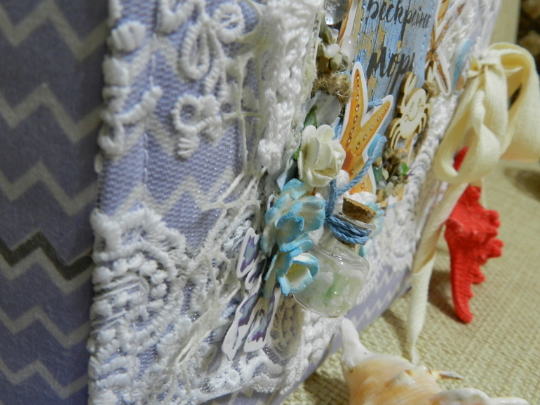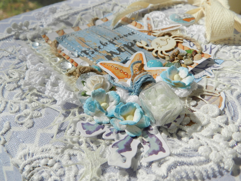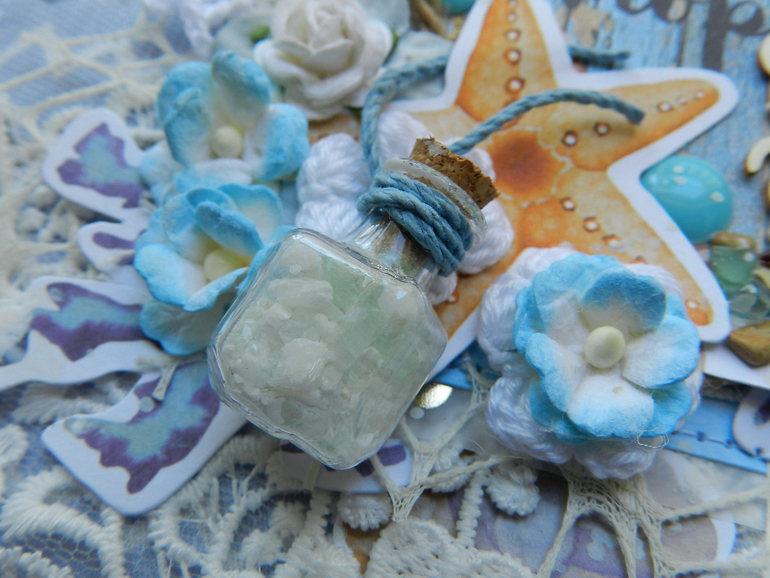 Тканевая обложка с кружевом, многослойная, украшенная мельчайшими камушками и ракушечками, в мини-бутылочке белый битый камень со скалы.