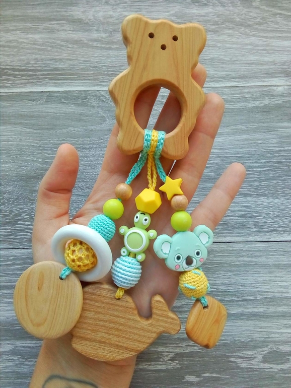 Бижутерия для слингомам. Слингобусы. Грызунки.Всего 34 года а моему внучатому племяннику уже годик. Вот связала для него грызунок. Ароматный Крымский можжевельник, силиконовые детали, вязаные бусины, как говорится "то что доктор прописал" )))