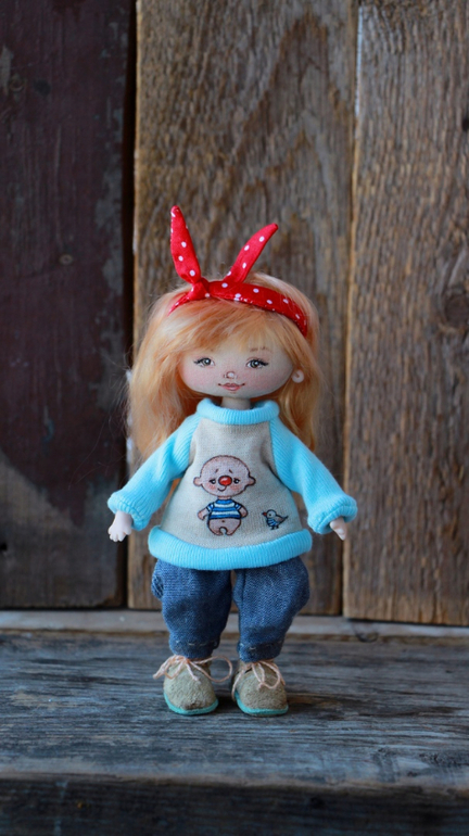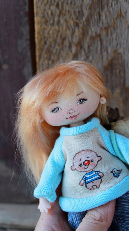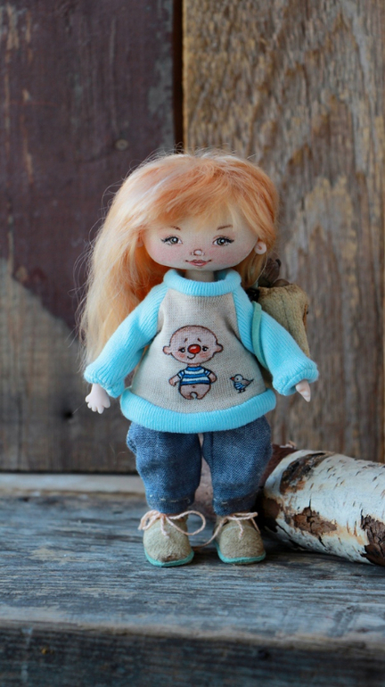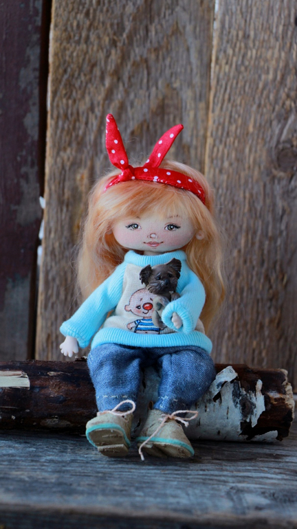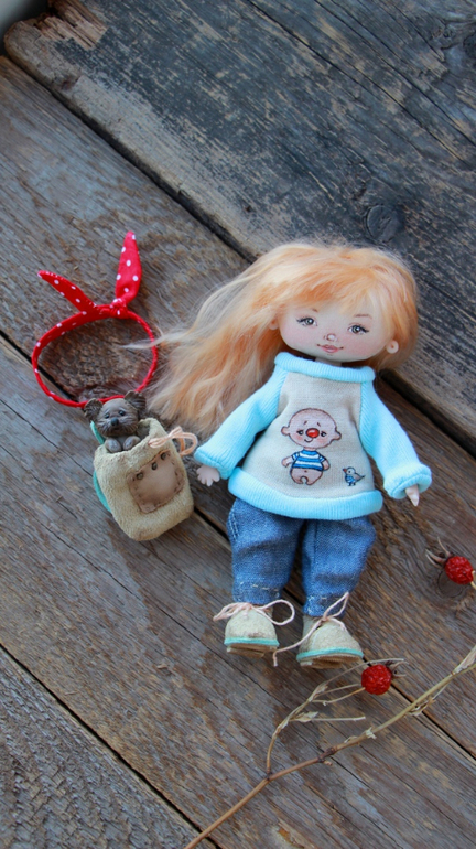 Кукольный мир - человекоподобные куклыДобрый день! Покажу вам куколку с условно- портретным сходством. В рюкзачке собачка, слеплена из фимо. Принт на свитшоте нарисован красками по ткани.Обувка и рюкзак из натуральной замши.Ростик 15см.