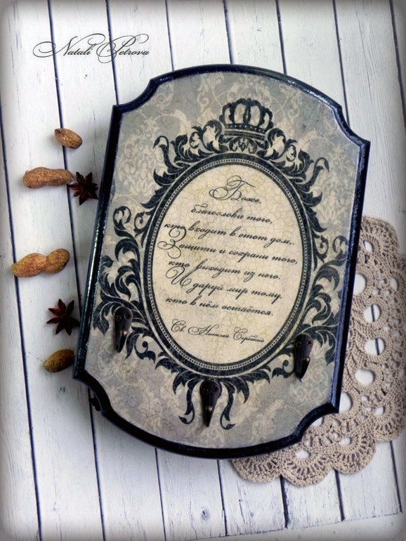 4. Очень удобная ключница выполнена в технике "Декупаж" с молитвой Св. Николая Сербского и 3-мя крючками для ключей. Удобство ее прежде всего в том, что в ней нет дверок, поэтому очень быстро можно как повесить, так и снять ключи. На задней стенке два подвеса.