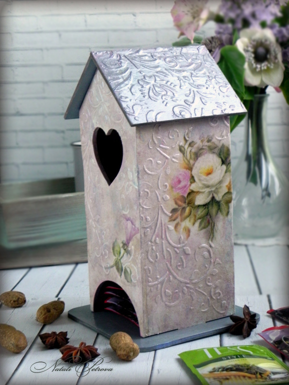 7. Чайный домик для хранения стандартных чайных пакетиков и короб-пенал выполнены в технике декупаж с применением безопасных и нетоксичных материалов. Внутренние стенки слегка тонированы чайной заваркой. Крышка у домика снимается, внутрь вкладываются чайные пакетики.