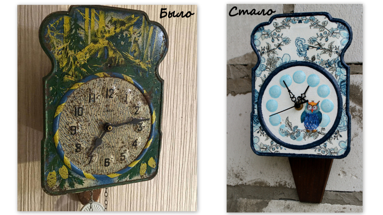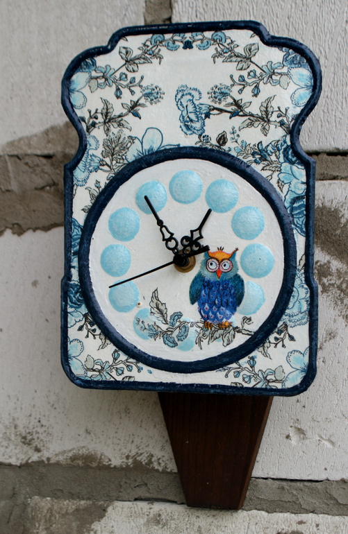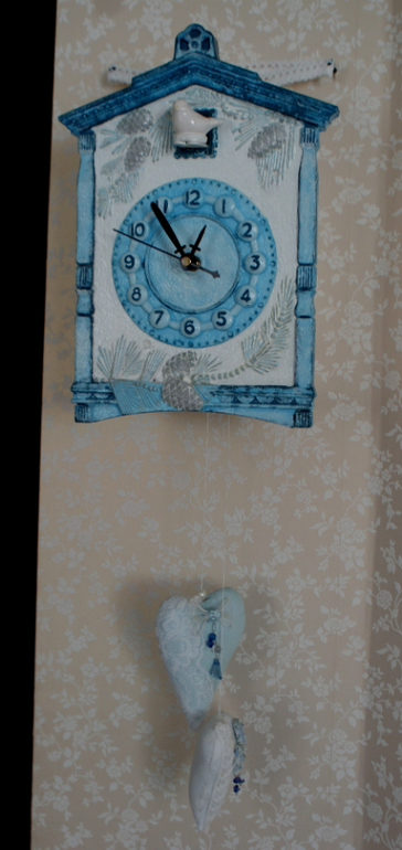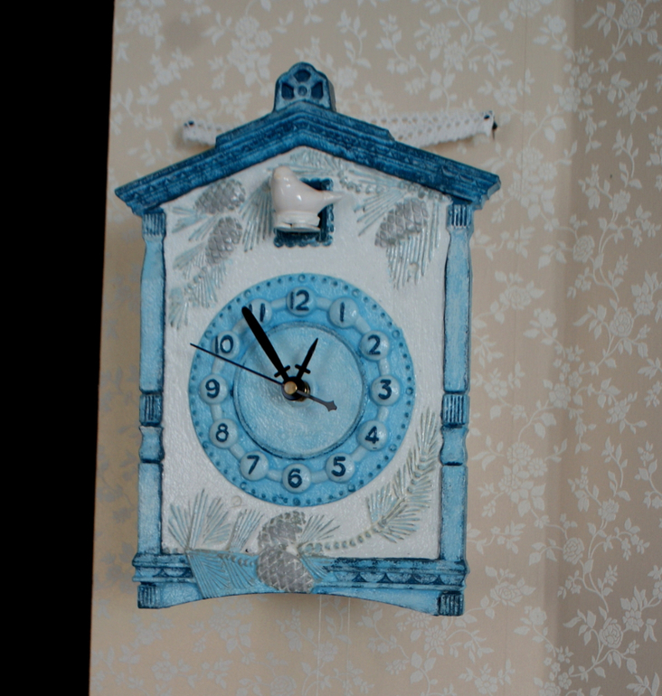 Часики-переделка. Уже давно мне муж привез от бабушки из деревни пару старых часов и ждали они своего часа несколько лет у меня. Все так же под новый голубой интерьер кухни, на замену предыдущих, тоже в форме домика (люблю домики в интерьере)