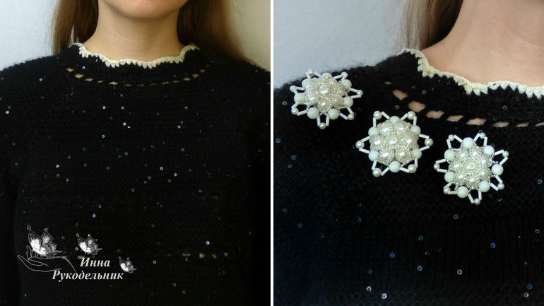 Бисер. Бисероплетение. Украшения из бисера.Сделала пришивные броши и украсила ими вязаные платья. Броши делала из бусин, бисера и фетра.