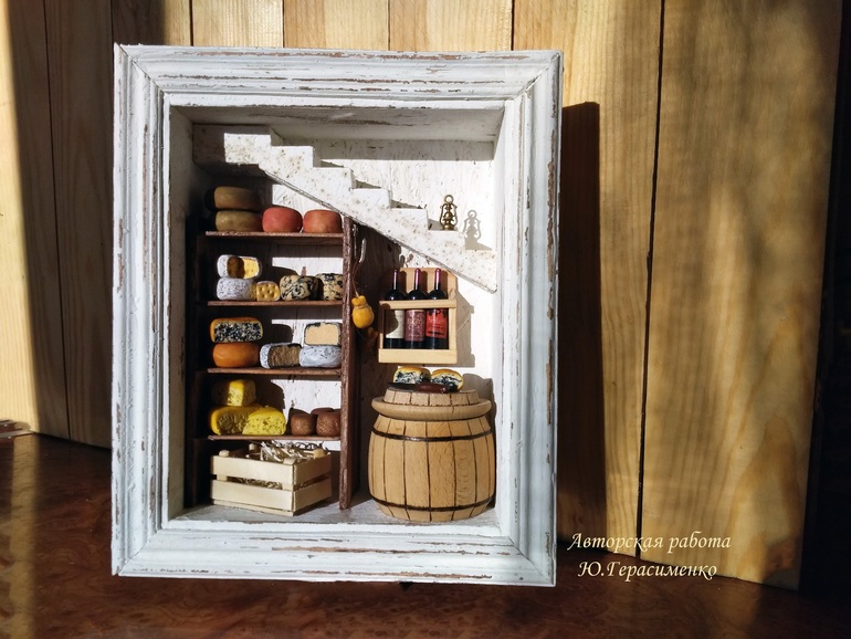 Основа - деревянный короб размером 21х25 см, глубиной 8 см. Сыры выполнены из полимерной глины (так что я теперь немного сыроДЕЛ 😃).