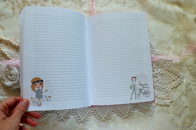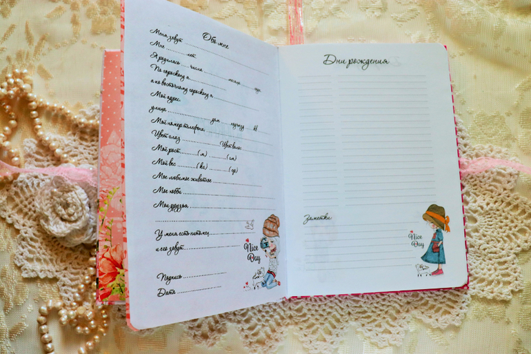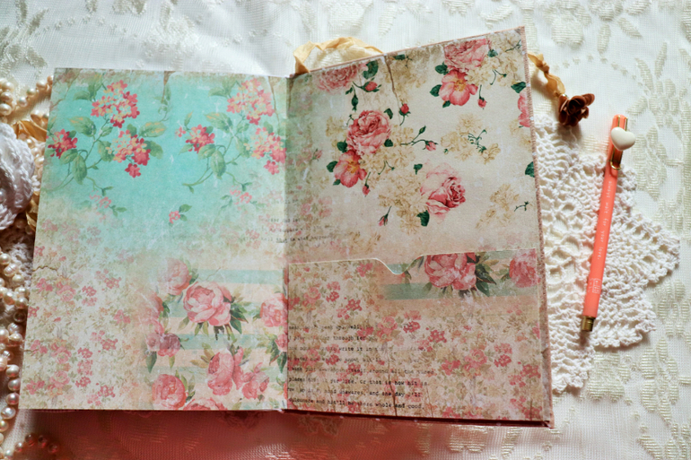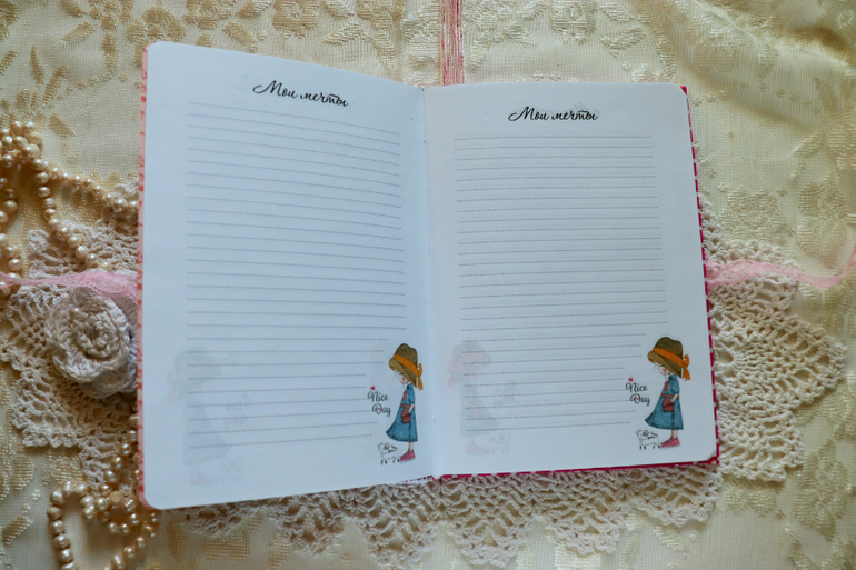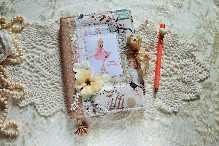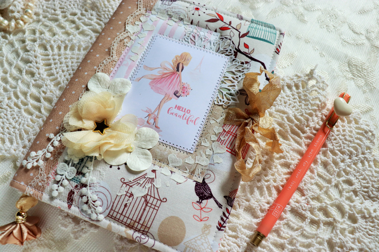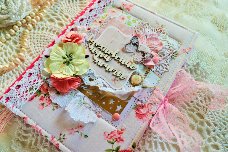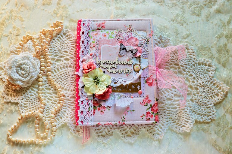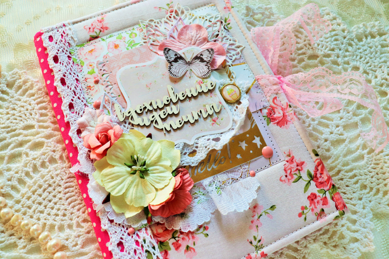 Формат А5, 140 страниц с куколками. Обложка украшена хлопковым кружевом, цветочками, вырубными элементами, дотсами, брадсом и чипбордом