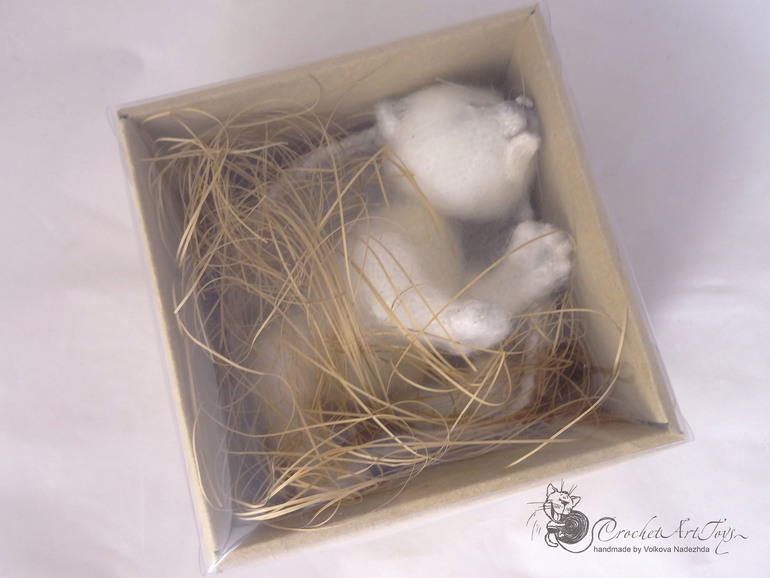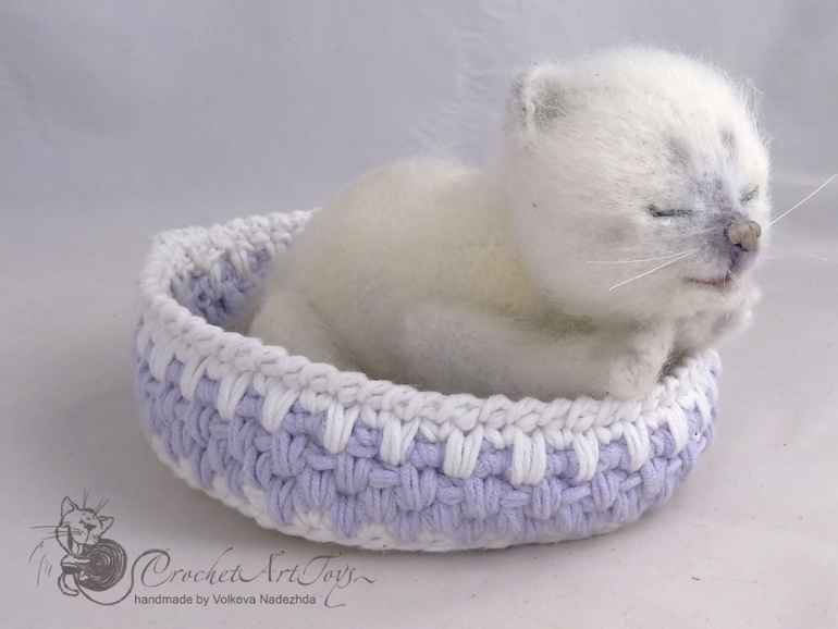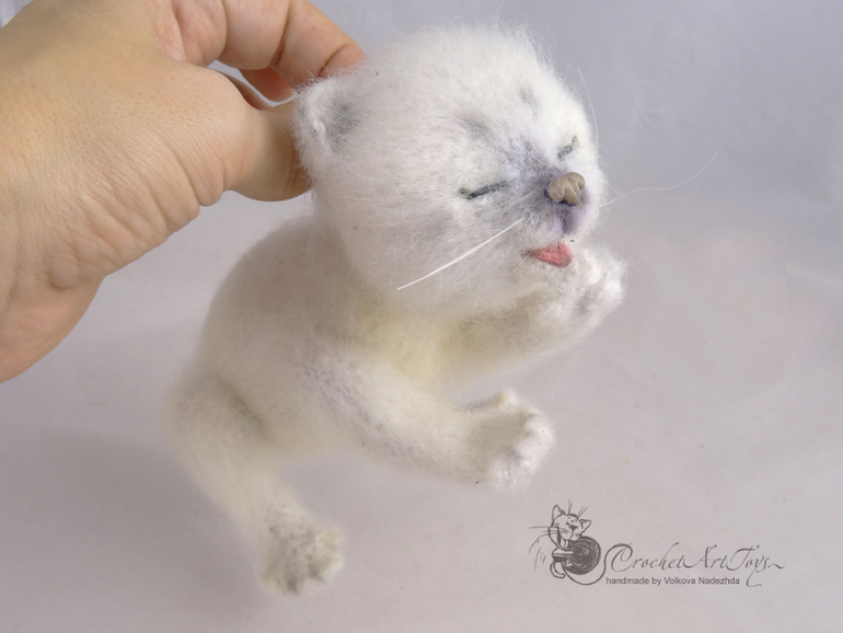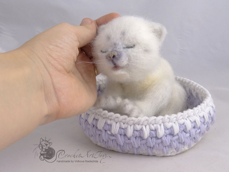 Амигуруми (вязаные игрушки)Готов еще один милый новорожденный котенок, связан по описанию Татьяны Коротких, мохерсодержащая пряжа. крючок 1,25 . 16 см от мордочки до попки, голова и лапки на шплинтах, может принимать различные позы. Носик из полимерной глины. тонирован масляной и сухой пастелью.