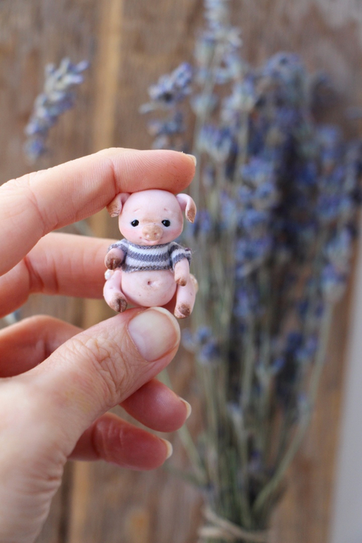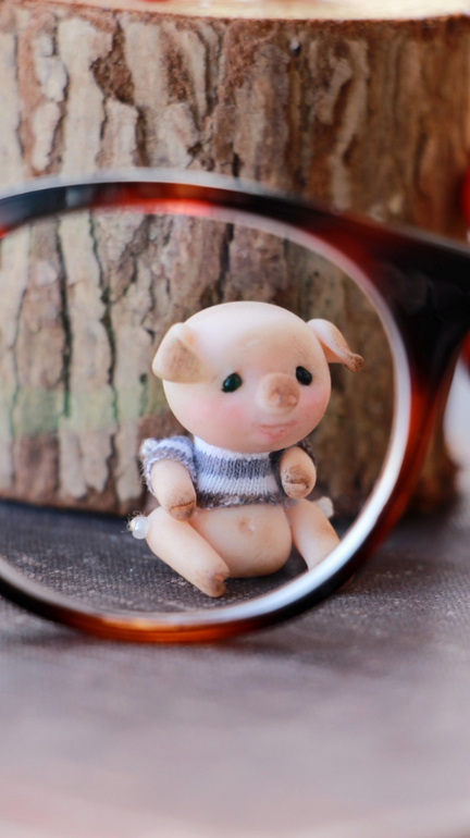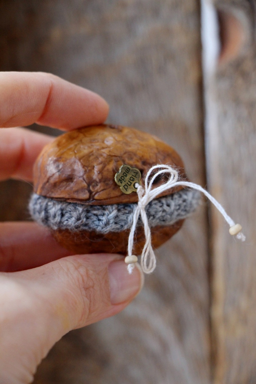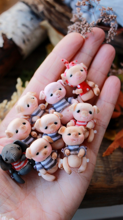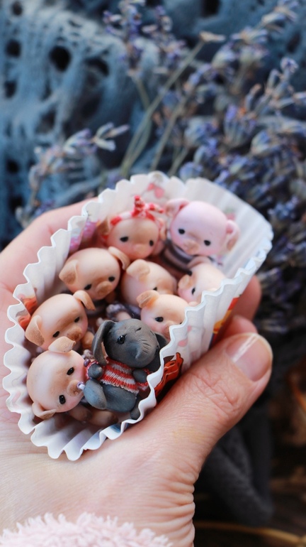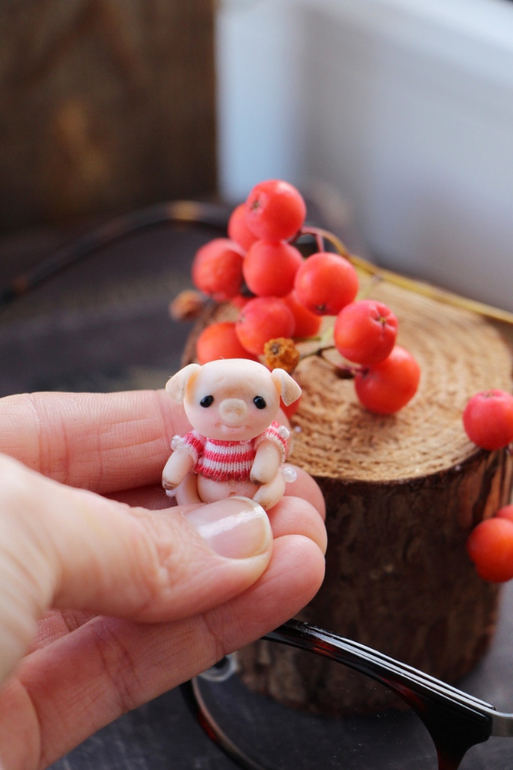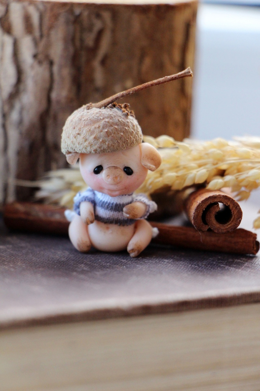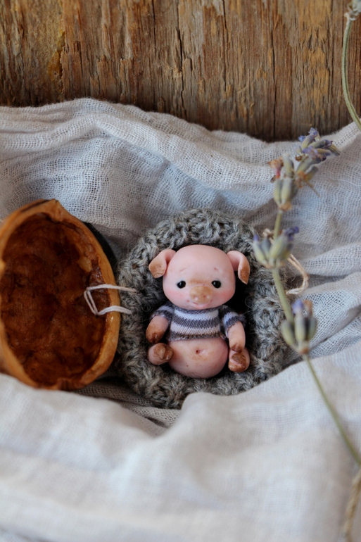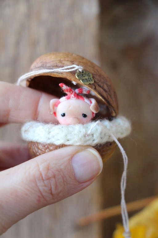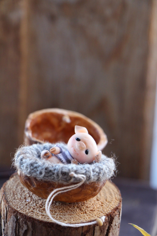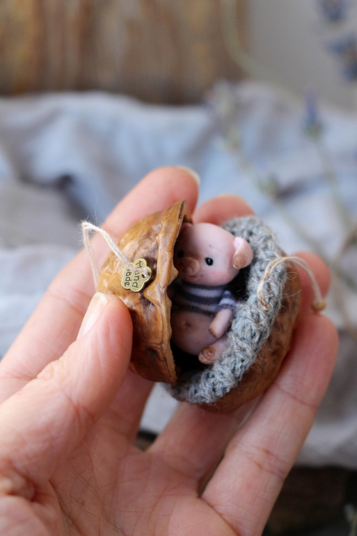 Игрушечный мир - животныеЯ к вам снова со свинками..) Малышки-свинки слеплены из фимо. Живут в грецком орешке. Мягонький чехол связан спицами.,орешек отшлифован изнутри, затонирован и покрыт лаком. Закрывается, чтобы малыши могли подремать в тишине)..