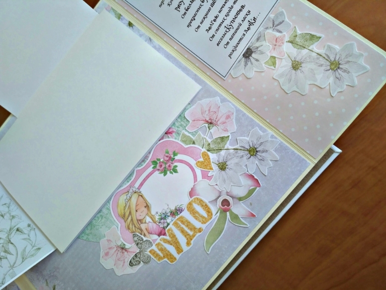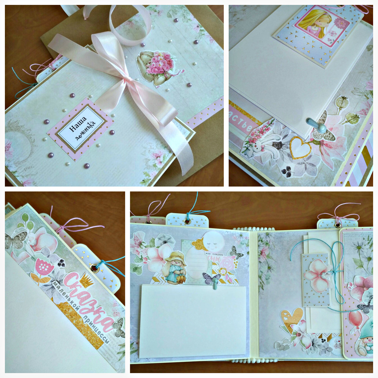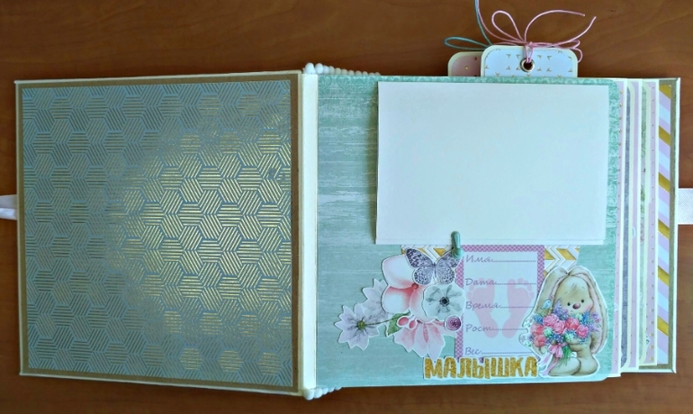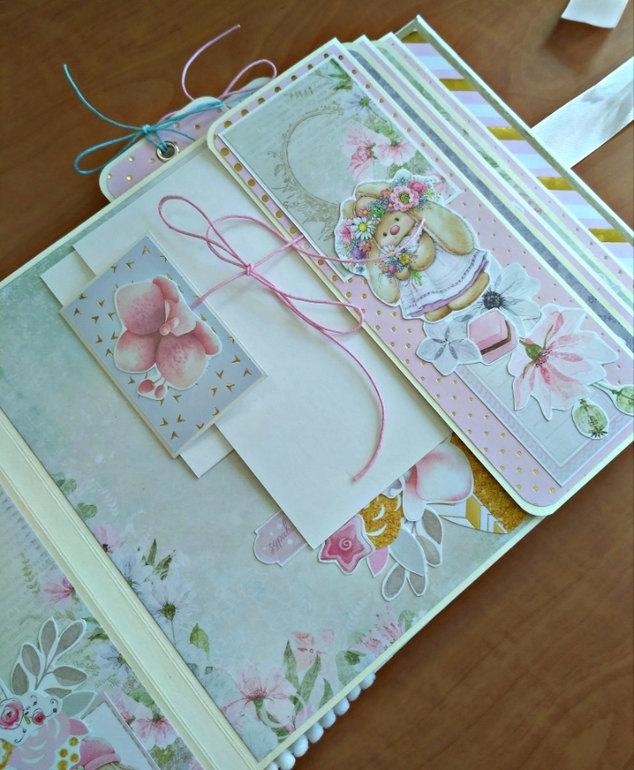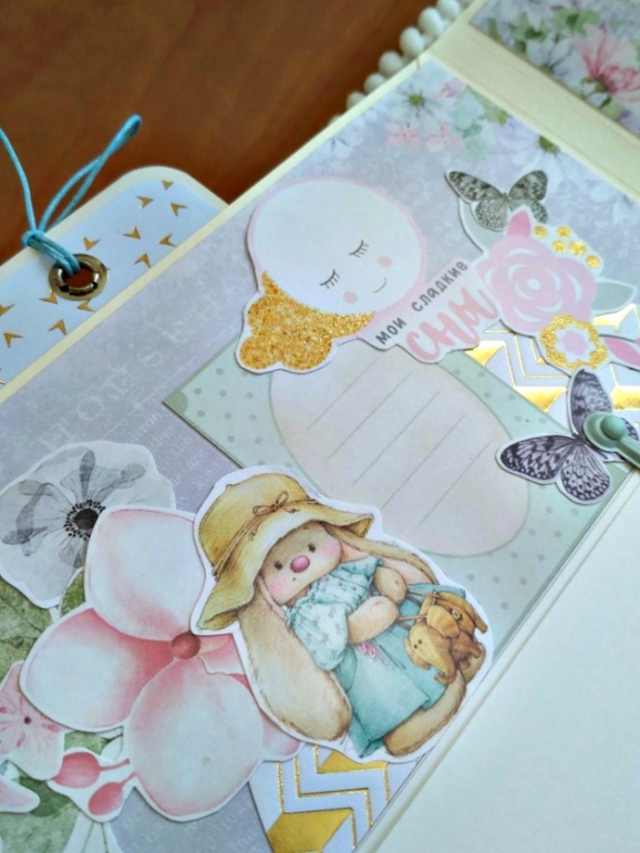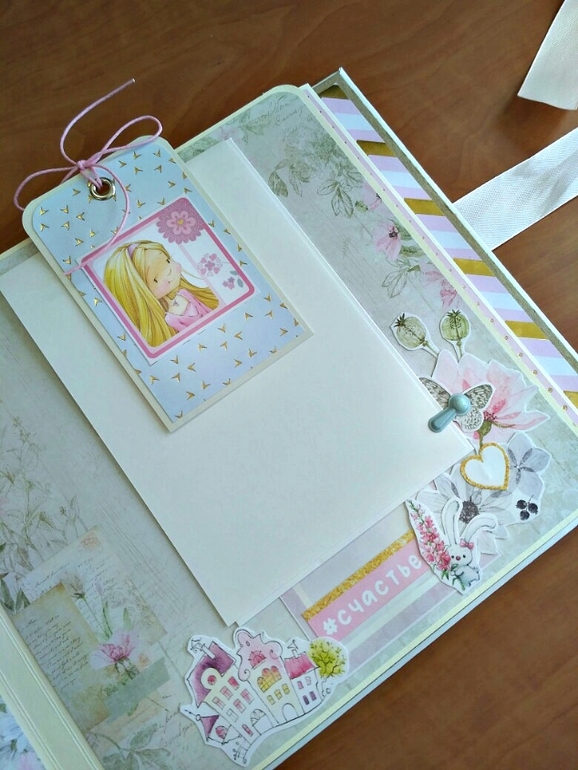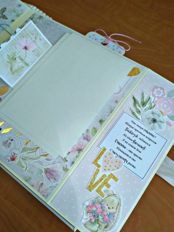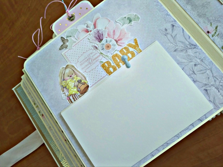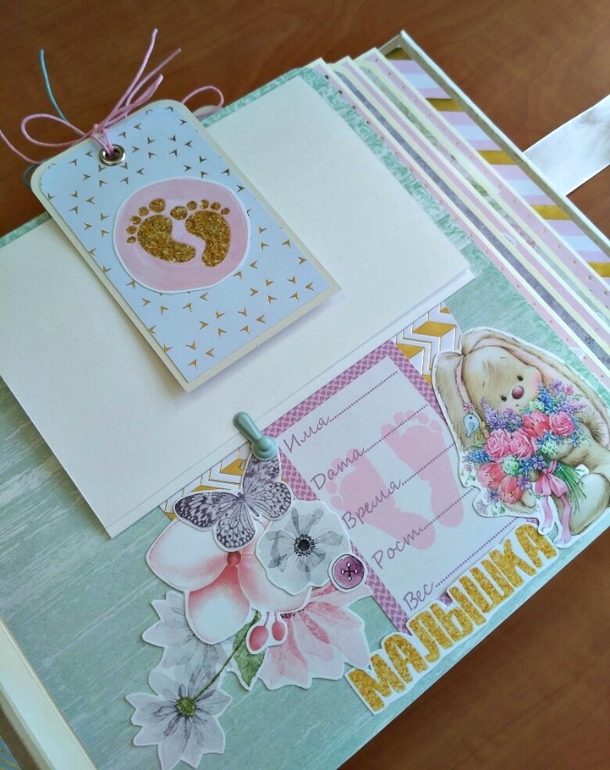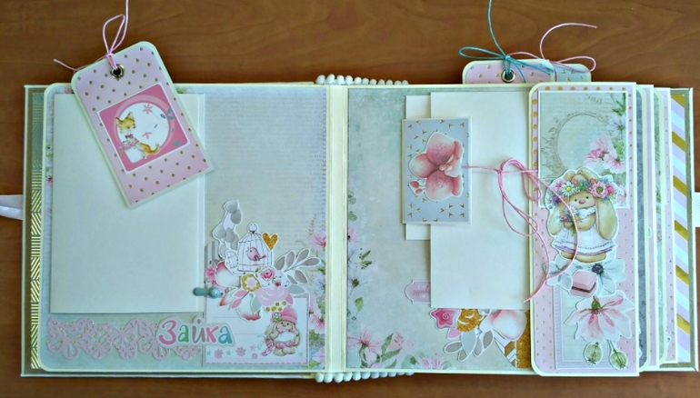 СкрапбукингНевероятно нежный, воздушный альбом для маленькой зайки. Формат альбома 21*21 см, 6 разворотов, вмещает более 60 фото стандартного размера. Альбом выполнен преимущественно в розово-сиреневых и нежно-зелёных тонах с добавлением золота. Чудесные стихи, надписи и картинки делают альбом таким добрым и уютным. Также в альбоме есть потайные разворотики, кармашки и бирочки. Нежная зефирка для малышки. К альбому идёт пакетик.