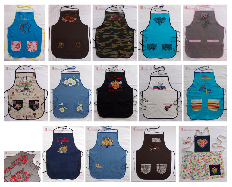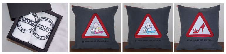 На обмен могу предложить фартуки с машинной вышивкой, автомобильные подушки или набор свадебных платочков (см. фото).