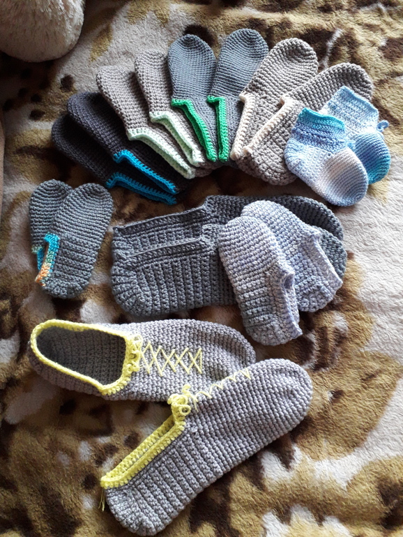 Вязание крючком (РАБОТЫ И СХЕМЫ)Целых 3 дня вязался набор из 9 пар чунь в многодетную семью . Довязала и выдохнула. Еле уломала заказчицу, чтоб разбавить серый, который она на все размеры заказала, бежевым.