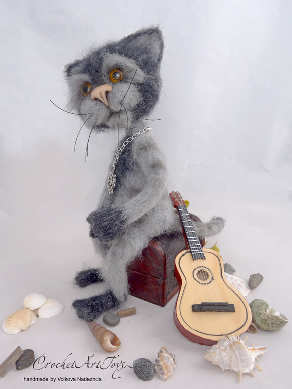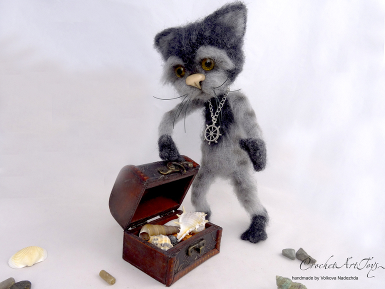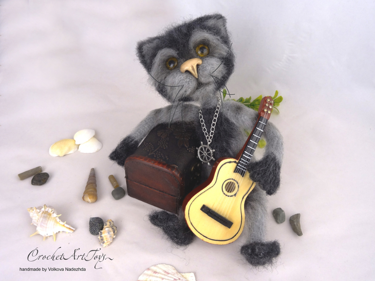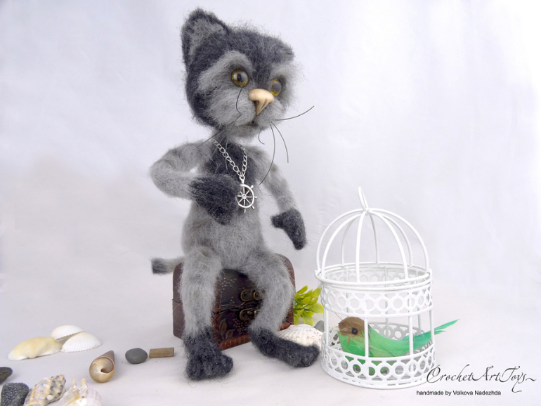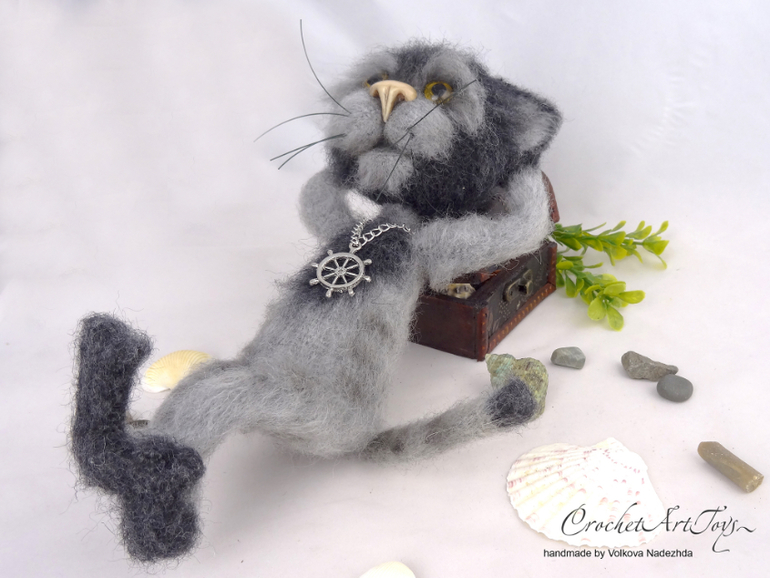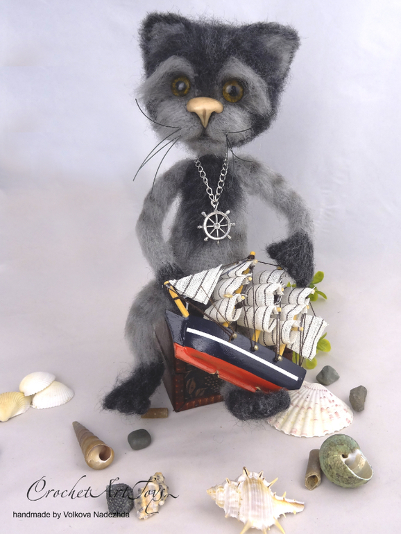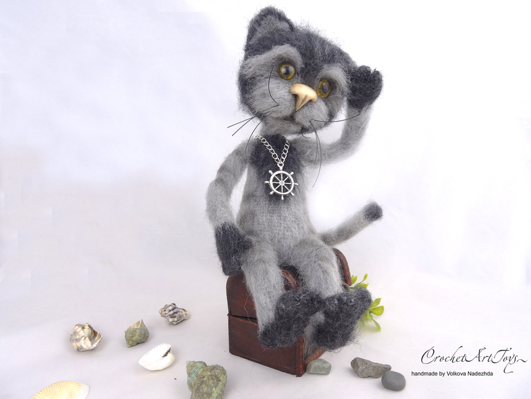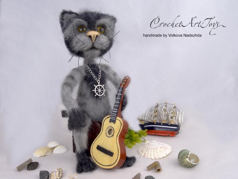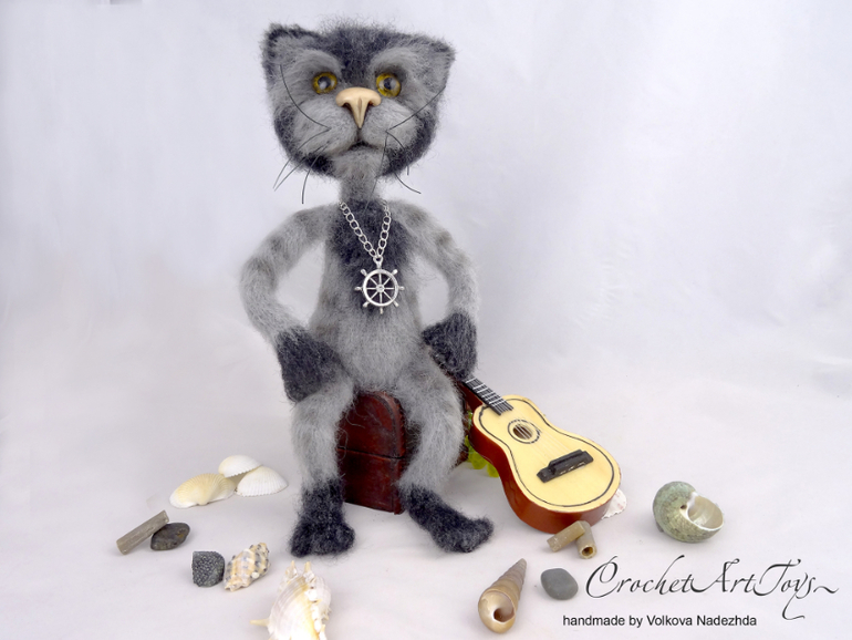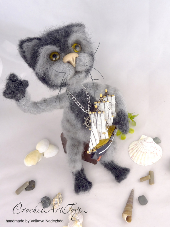 Амигуруми (вязаные игрушки)По мк Эльвиры Супонькиной связался котейка, назвался Боцман) В молодости служил штатным котом мышеловом на корабле, а сейчас на заслуженной пенсии немного тоскует по морю и вспоминает свои морские приключения) Ростиком сидя 22 см, связан из мохерсодержащей пряжи, крючок 1. На проволочном каркасе благодаря чему очень подвижен. Тонирован сухой и масляной пастелью, глазки стекло, нос слеплен из полимерной глины.