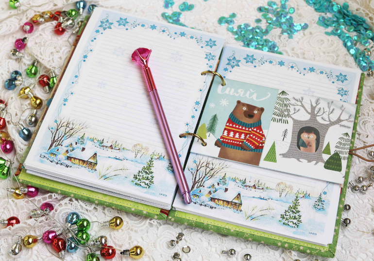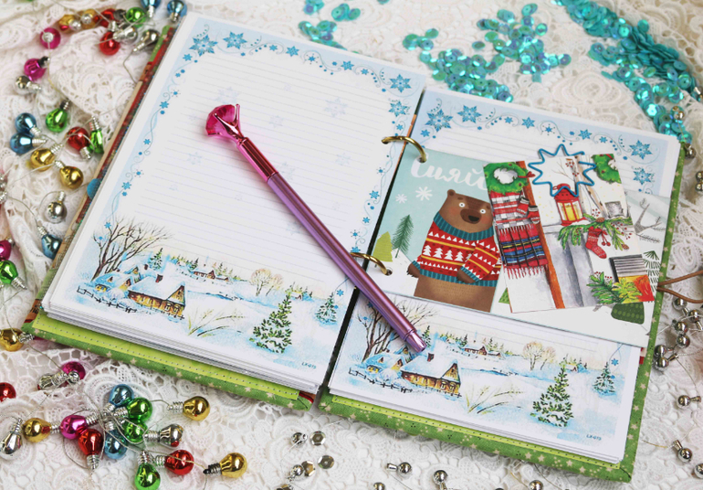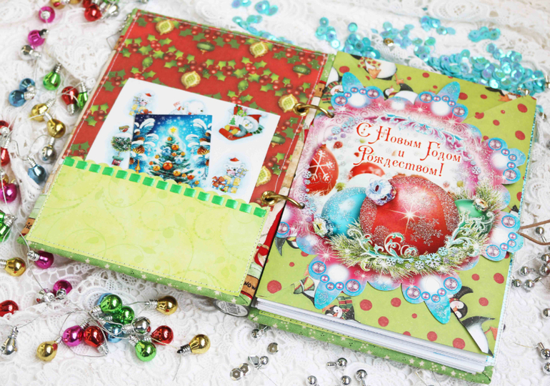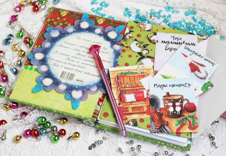 СкрапбукингВ него входит: красивая ручка, открытки новогодние, карточки. конверты. наклейки, калька с золотым рисунком, кармашки для важных бумажек, теги, шейкер-антистресс, разделители и много всего интересного)) Дальше много фото: