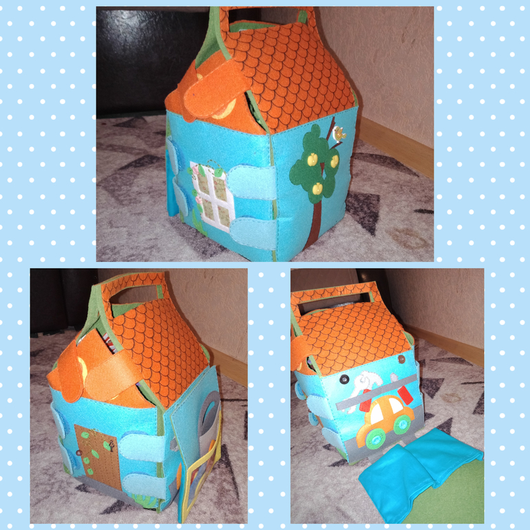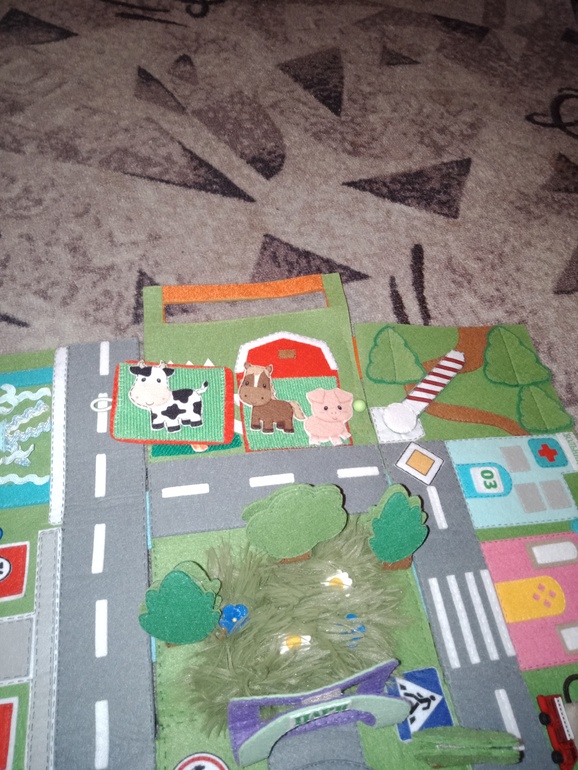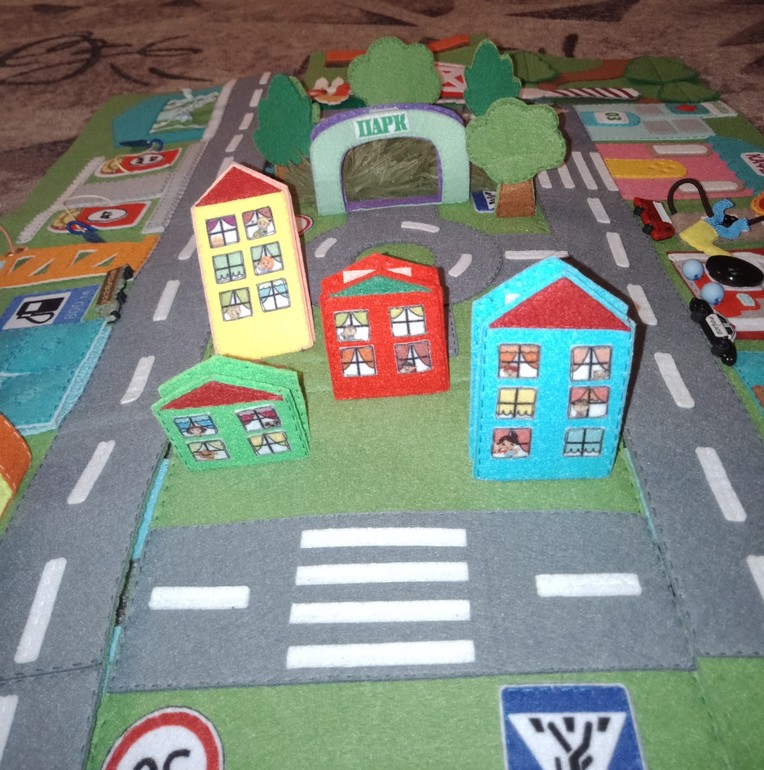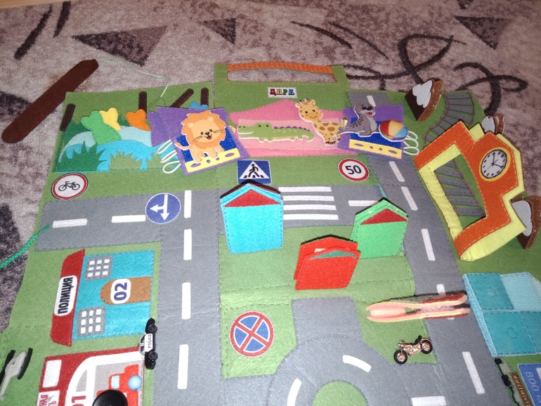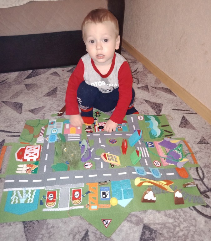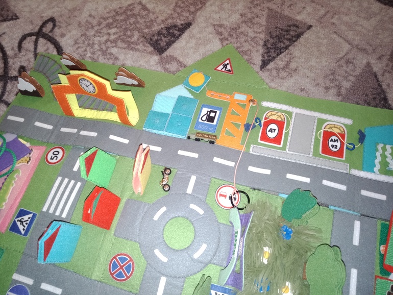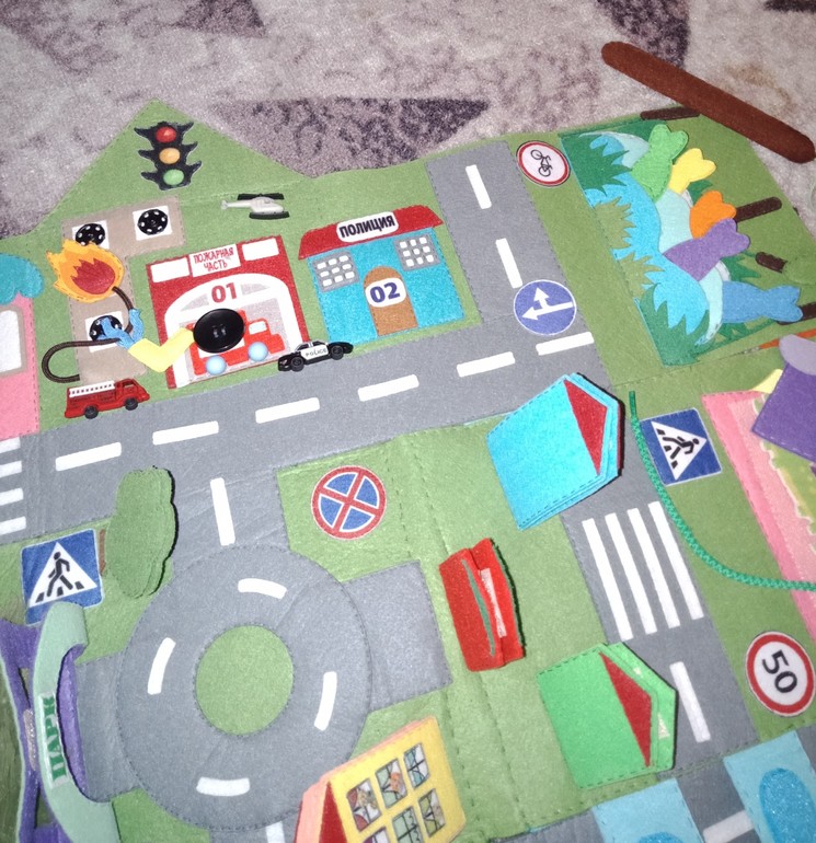 На нашей дороге не только огромное поле для ролевых игр, но и масса развивающих и тактильных элементов. А собирается она в очень удобный и компактный домик, между прочим, с гаражом и фетровым автомобилем.