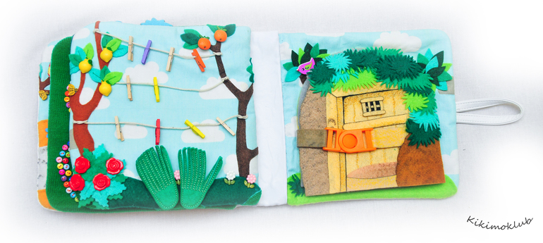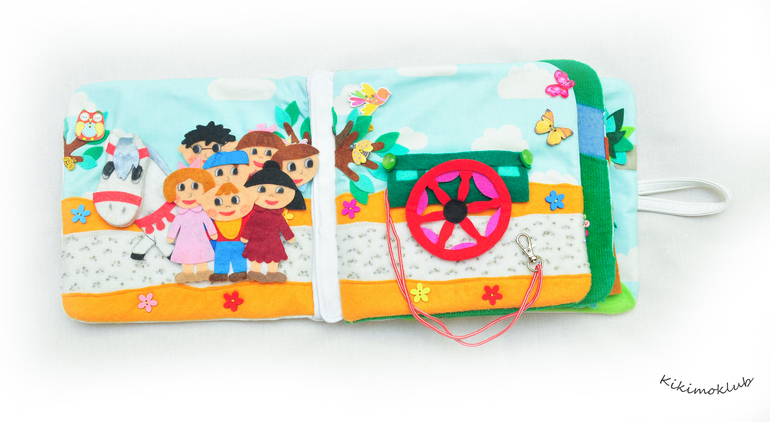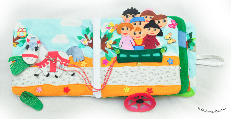 Сюжет на песенку "У пони длинная челка из нежного шелка". Лошадку можно накормить травой, отыскав её на другой страничке книжки. Также нужно найти вторую пчелу, пристегнуть колесо к телеге, а телегу к лошадке. Детей нужно посадить в тележку, отстегнув и пристегнув при этом створку тележки.
