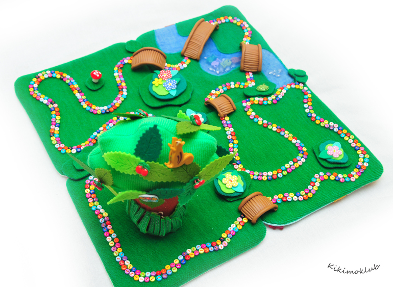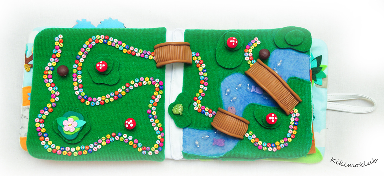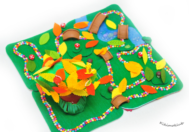Сюжет по мотивам песенки "Ежик резиновый". Грибы, зеленые островки и мосты - на липучках, их можно прилеплять на страничке в произвольном порядке. Рыбки в речке плавают.
