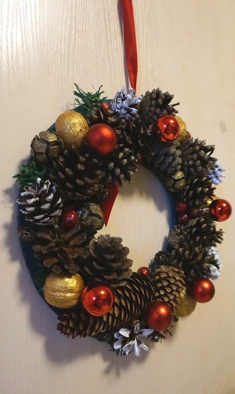 Использовали: картон от коробки, шишки еловые, сосновые (2 или даже 3 вида сосен), кипарисовые, шишки лиственницы, лесные орехи, красные пластмассовые бусины, пластмассовые ёлочные шарики из серии (4.60 за шарик), ветки от искусственной ёлки из фикс-прайса, зелёную золотую, тёмно-золотую и белую акриловые краски.