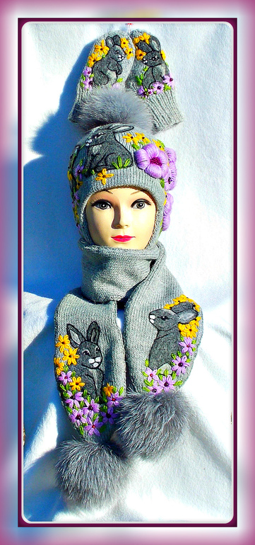 У меня обычно не задерживается ничего дома))))) Вот и сейчас в наличии только этот серенький комплект и еще есть заготовка светло-голубых рукавичек под вышивку. Да две небольшие сумочки)))